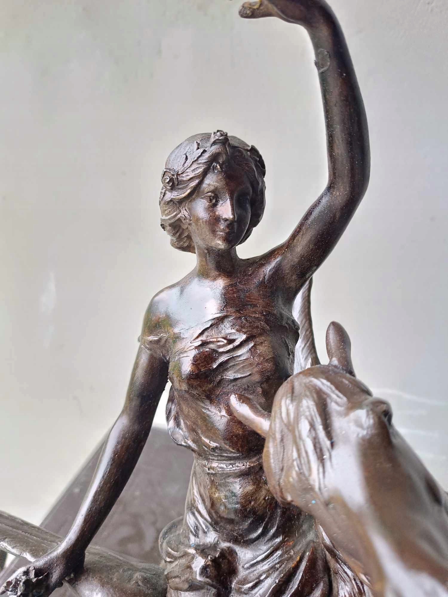 Часы изготовлены из цинка и бордового мрамора, на них изображена сидящая девушка. на пегасе, пинающемся над механизмом.