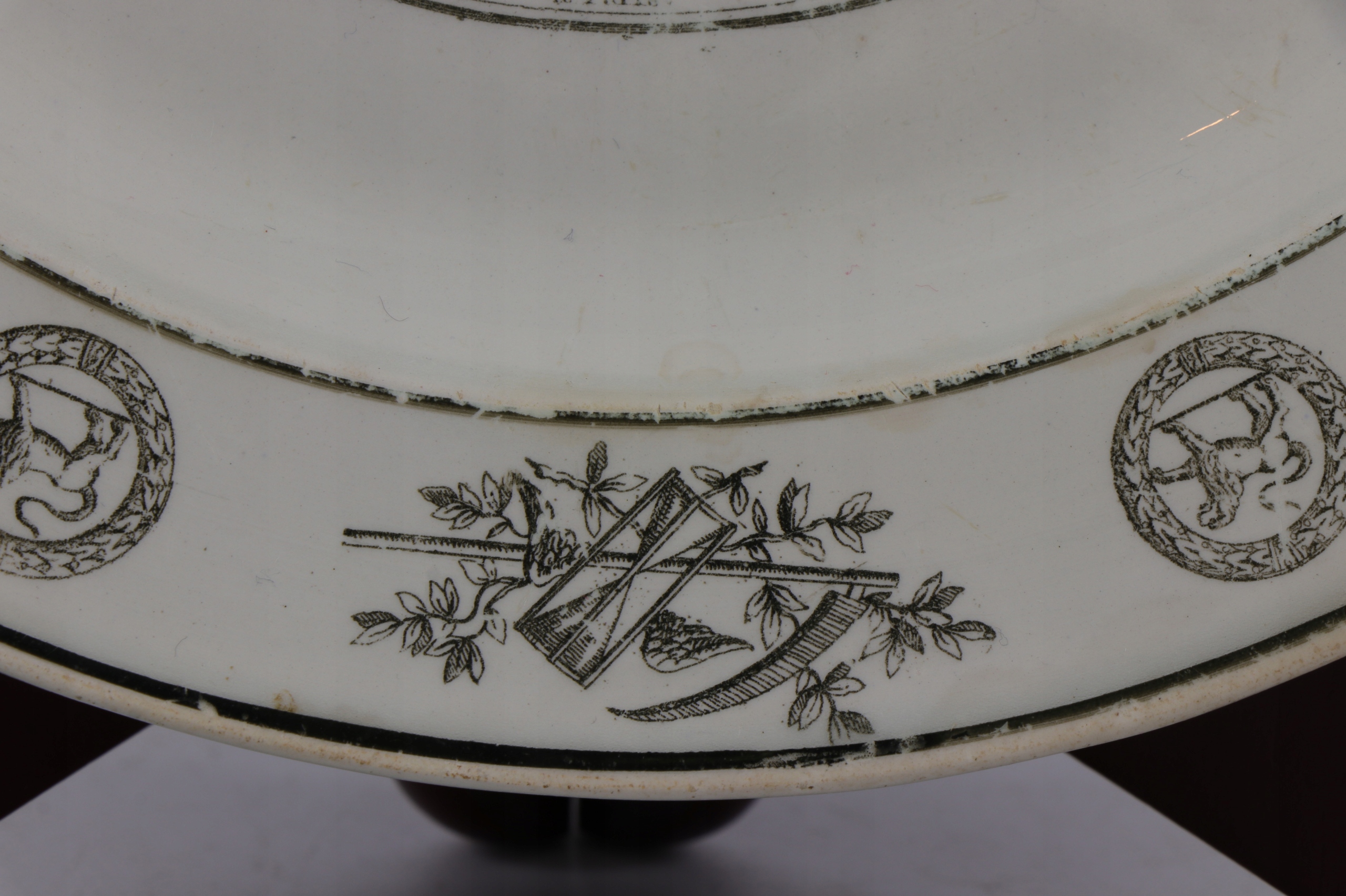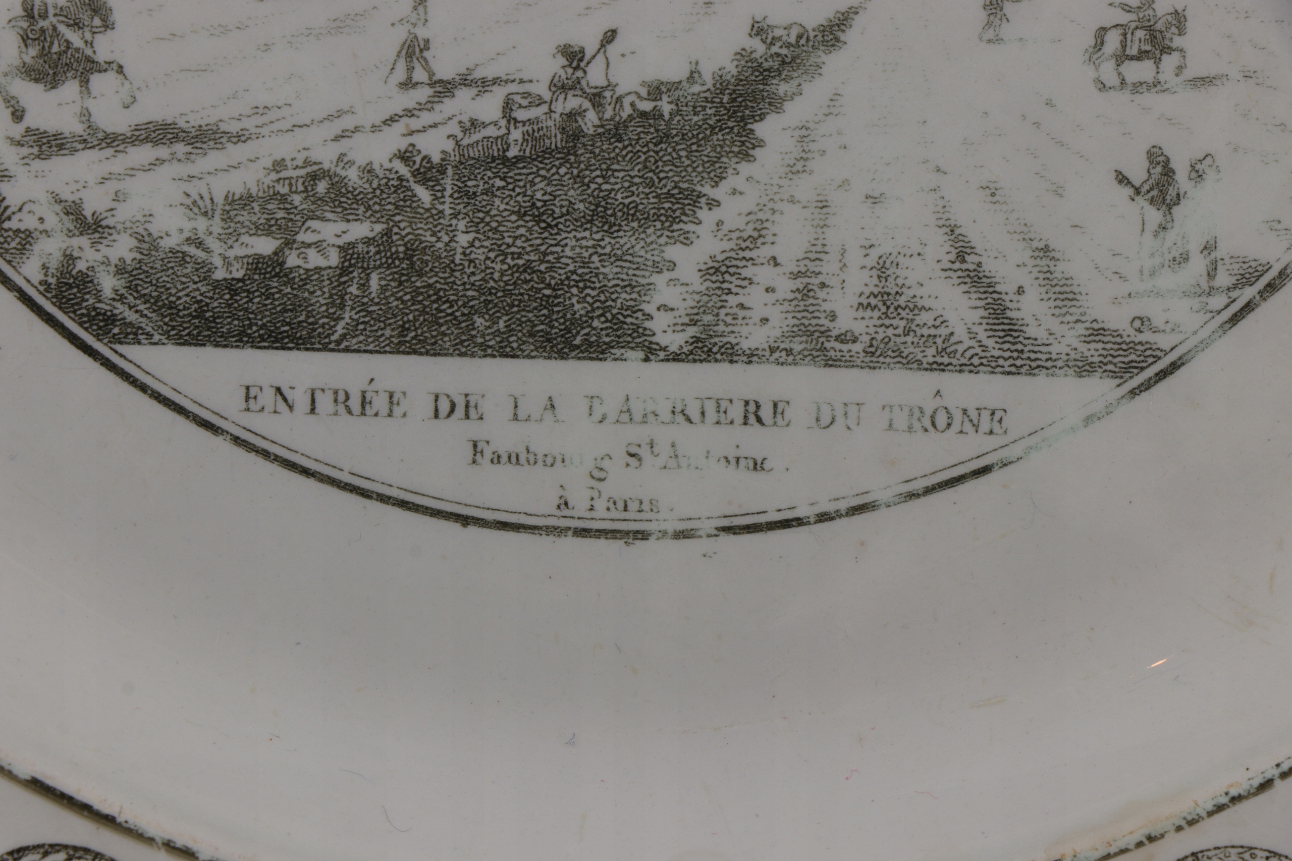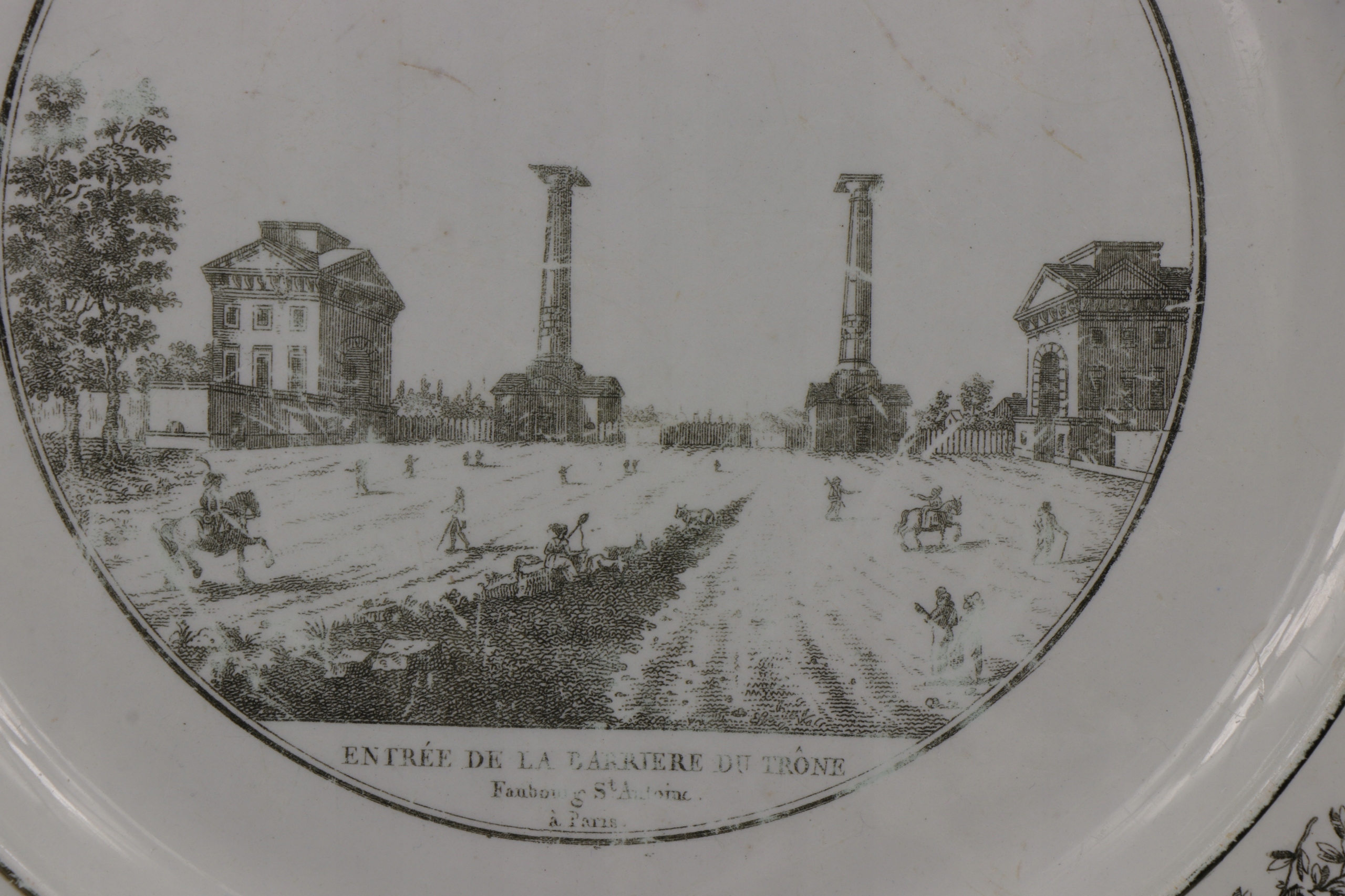 Очень интересная и редкая тарелка, изготовленная в период Наполеона, первой империи, на фабрике Крей. Тарелка входит в серию, изображающую памятники Парижа. Табличка, украшенная репродукцией вида на Ворота дю Трон, символические ворота для сбора пошлин и налогов на товары, ввозимые в столицу Франции, «Entree de la darriere du Trone a Paris». Край украшен красивым орнаментом в стиле ампир, напоминающим наполеоновские символы. Предлагаю еще три тарелки из вышеуказанной серии на других аукционах.
