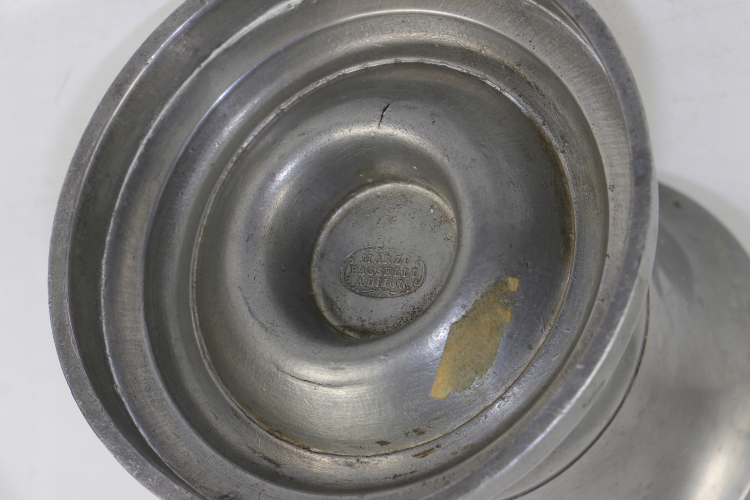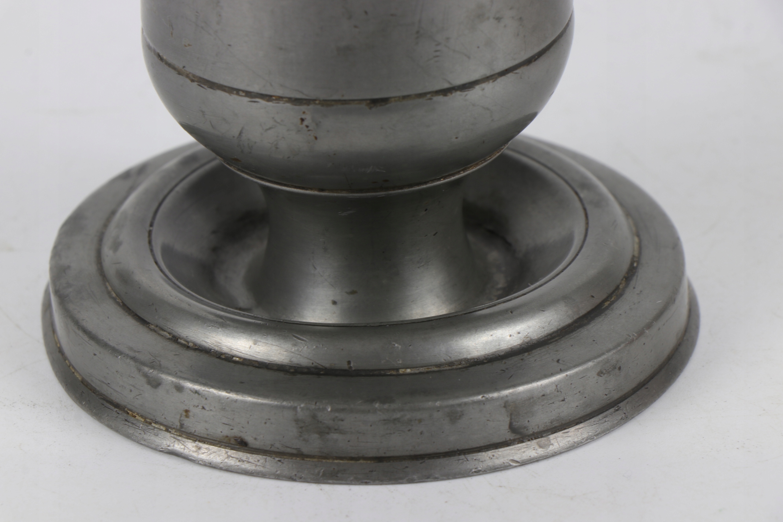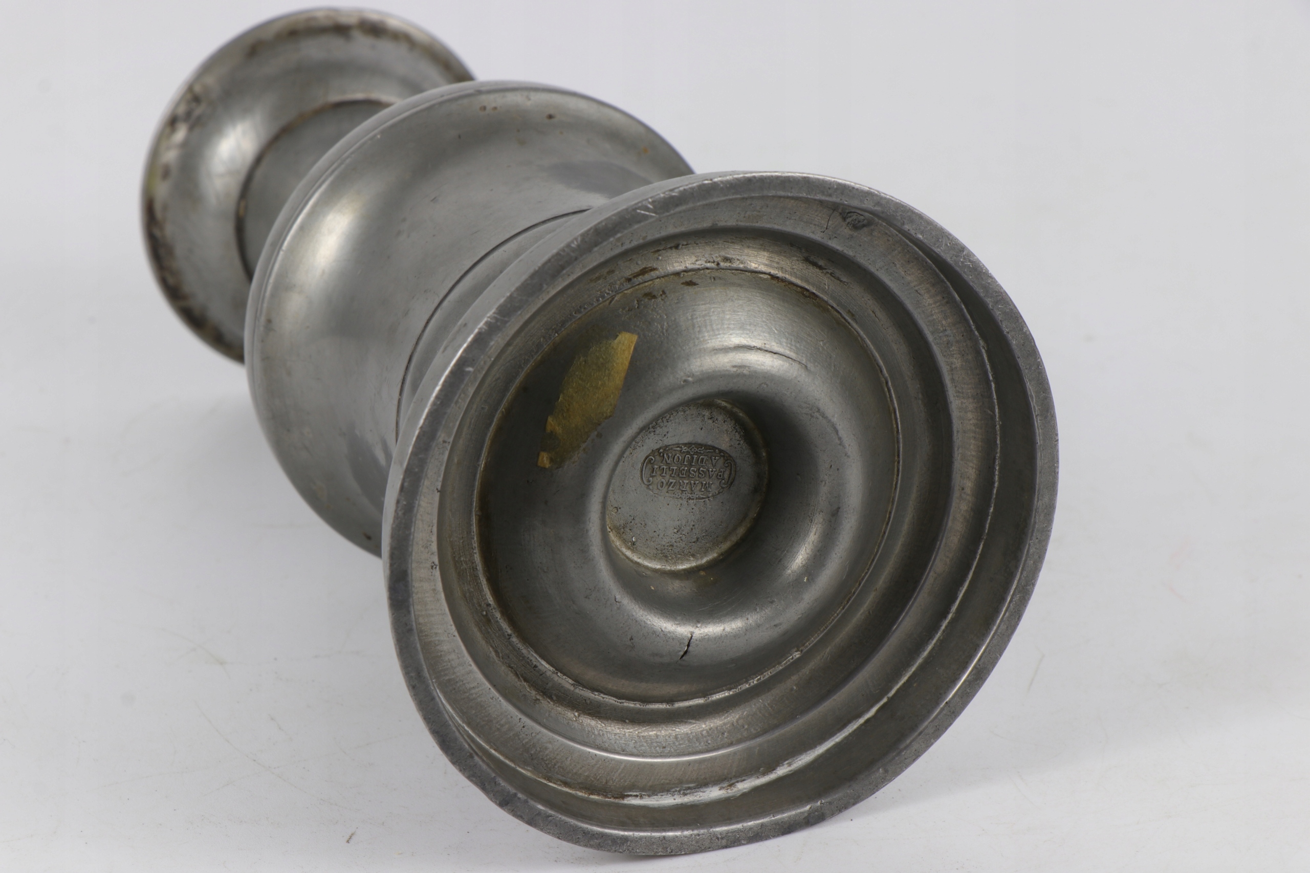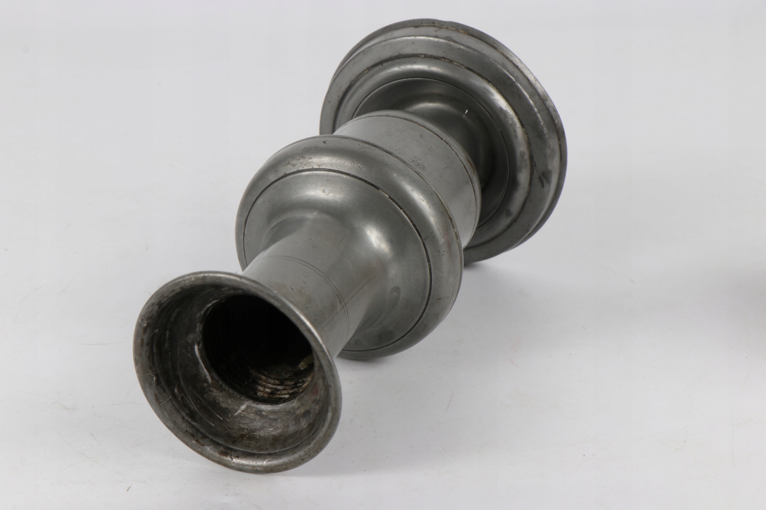 Олово подписана с подсвечником 19 -го века. В верхнем отверстии была ввинчена видимая нить, в которой была привинчена еще одна часть подсвечника. Условие субъекта