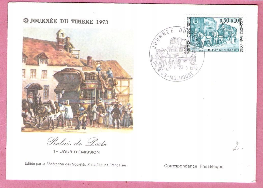 Francja 1973, FDC Mulhouse, transport poczty, konie, dyliżans