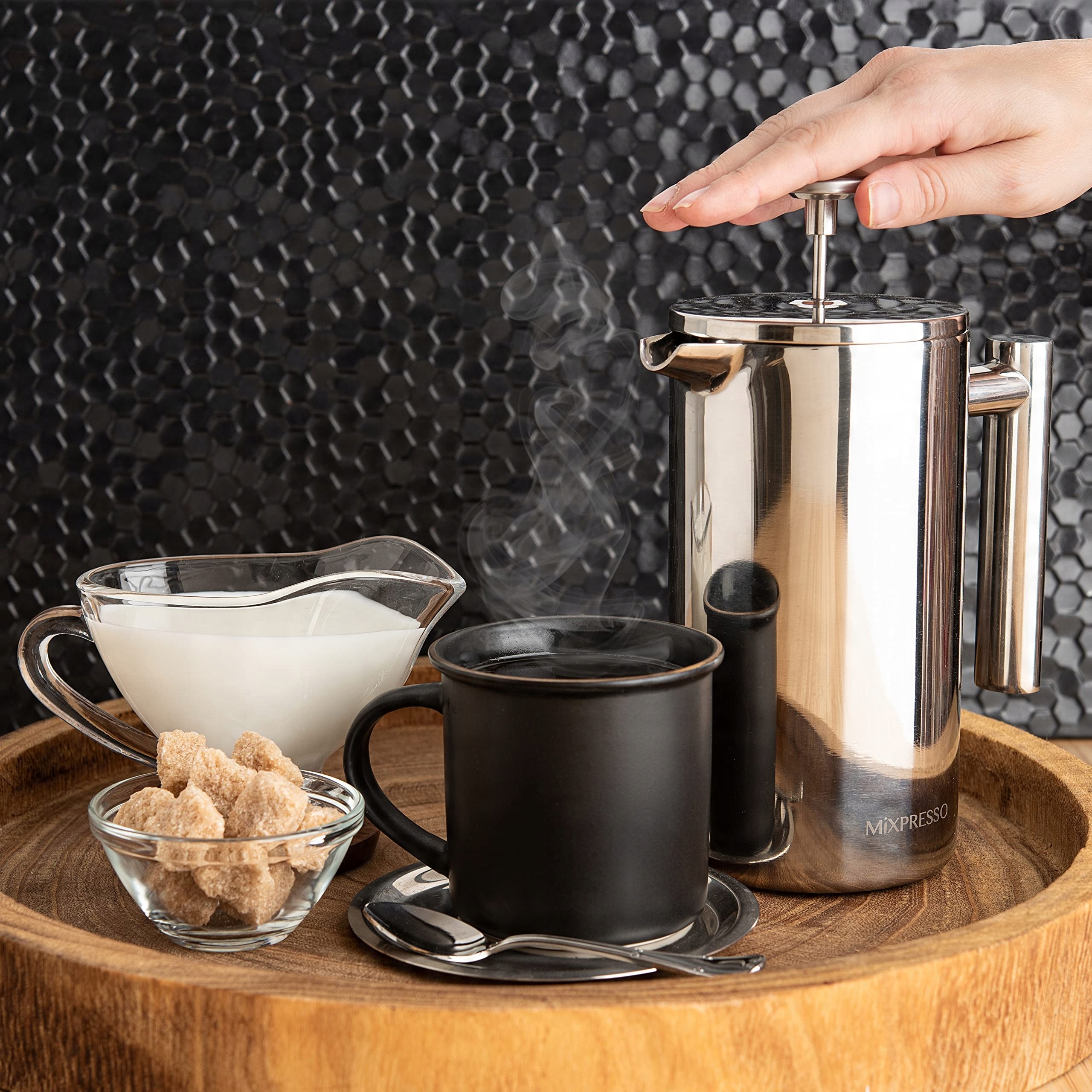 Кофеварка из нержавеющей стали изготовлена из высококачественной нержавеющей стали как внутри, так и снаружи. Другие френч-прессы можно использовать с одной стороной из нержавеющей стали, но френч-пресс из нержавеющей стали рассчитан на то, чтобы прослужить дольше других производителей эспрессо. Внутри и снаружи нержавеющая сталь образует конструкцию с двойными стенками, которая более удобна для сохранения теплого контраста с одинарной стеной. Поэтому пить кофе низкой температуры привлекательно. При необходимости он может дольше сохранять ваш эспрессо горячим.