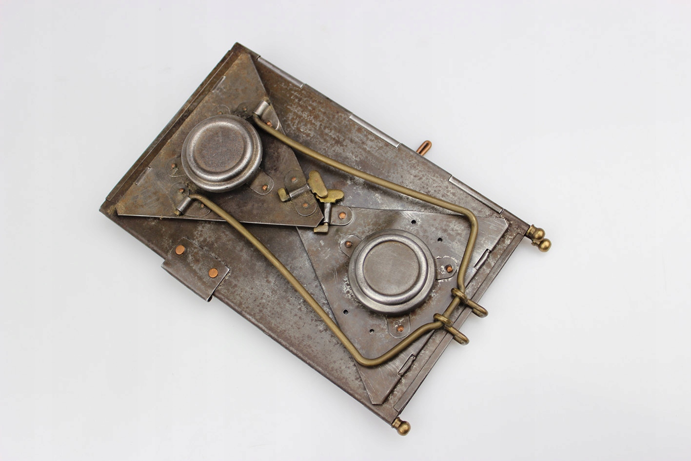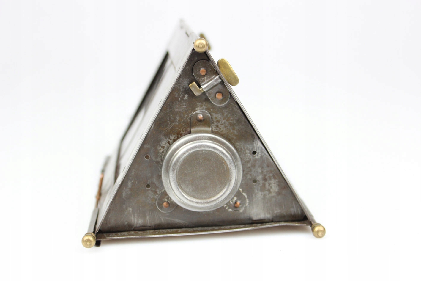 Прекрасно сохранившийся французский траншейный фонарь со свечой времен Первой мировой войны, использовавшийся Войском Польским в 1918-1939 годах. Светильник изготовлен из оцинкованного стального листа с латунными элементами отделки. Сменные линзы, изготовлены из пластика и стальной оправы. На спине подвижная ручка для переноски и частично видимая подпись производителя ...LUX PARIS. Транспортные размеры: 19см х 12см. Размеры после сборки: с открытой дужкой: 32 см х 11,5 см.