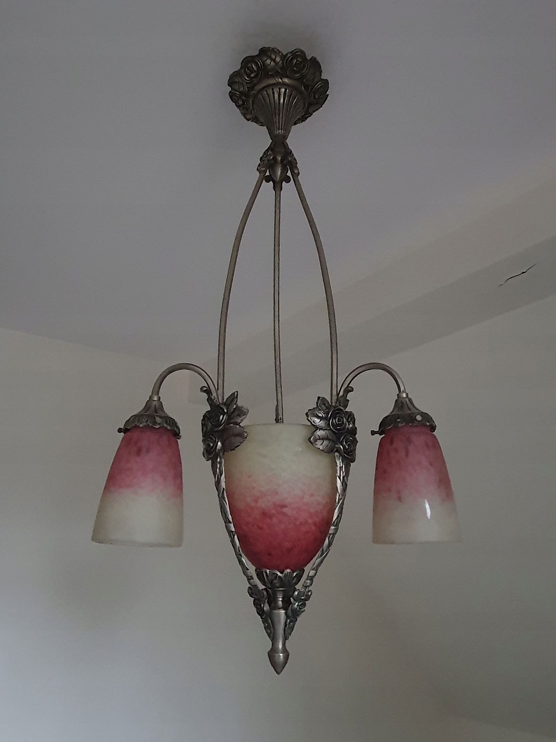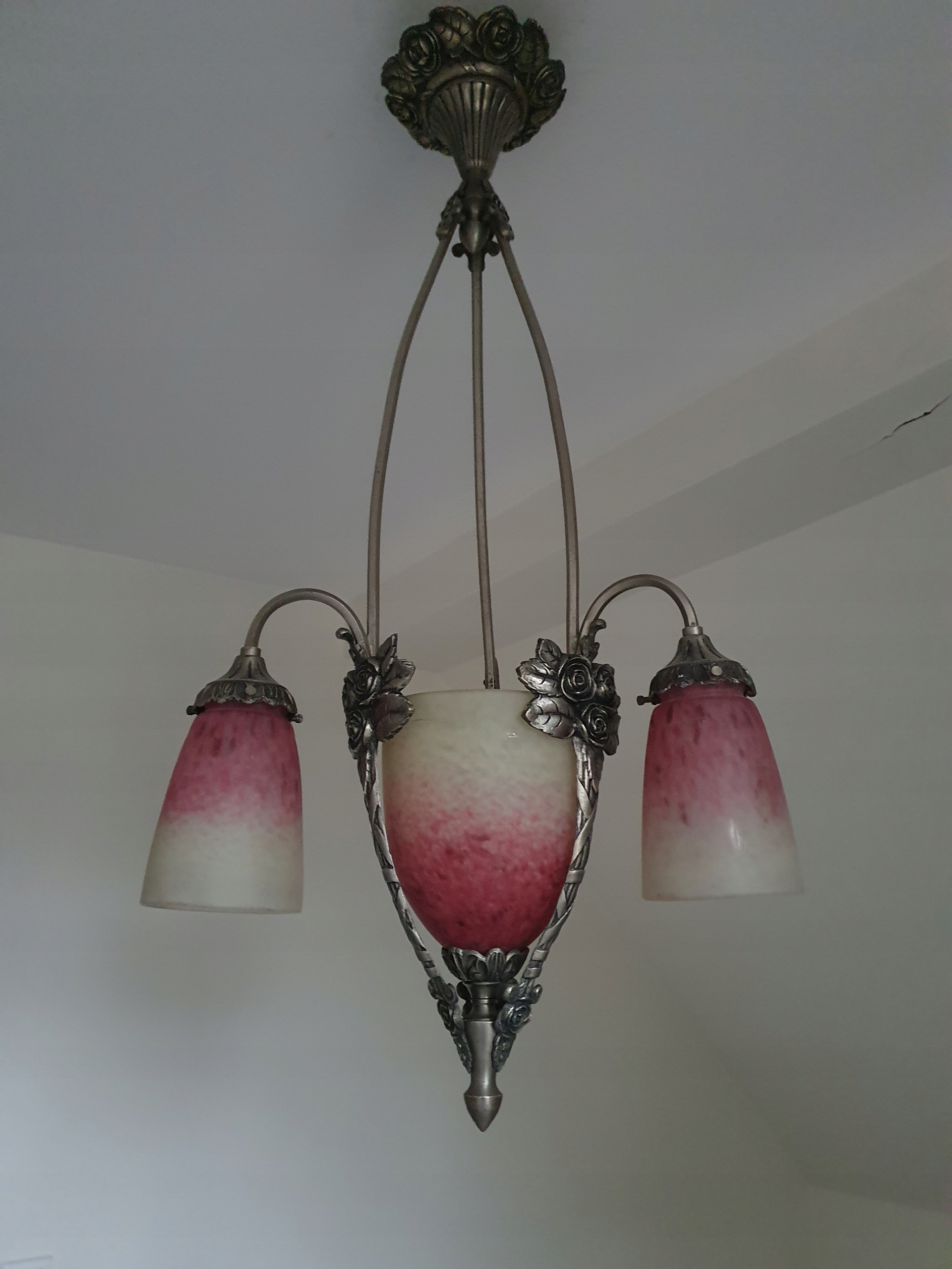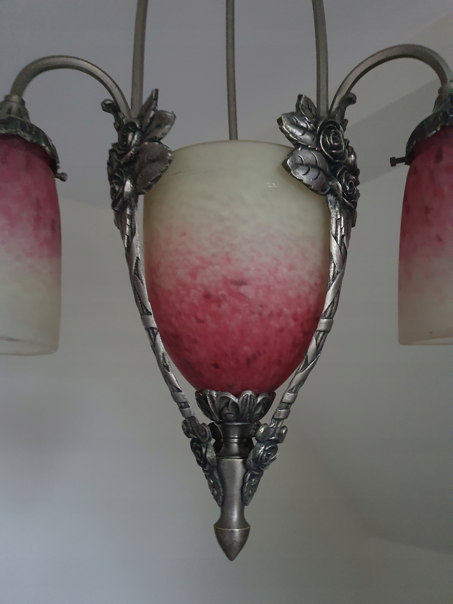 Элегантная люстра в стиле французского ар-деко примерно 1930 года, оснащенная тремя оригинальными абажурами с подписью Schneider. Абажуры имеют двухцветную структуру из пыльного стекла, типичную для Чарльза Шнайдера, в оттенках розового и белого. Они родом из периода деятельности его завода, производившего художественное стекло высокого класса преимущественно в 1920-1935 годах.