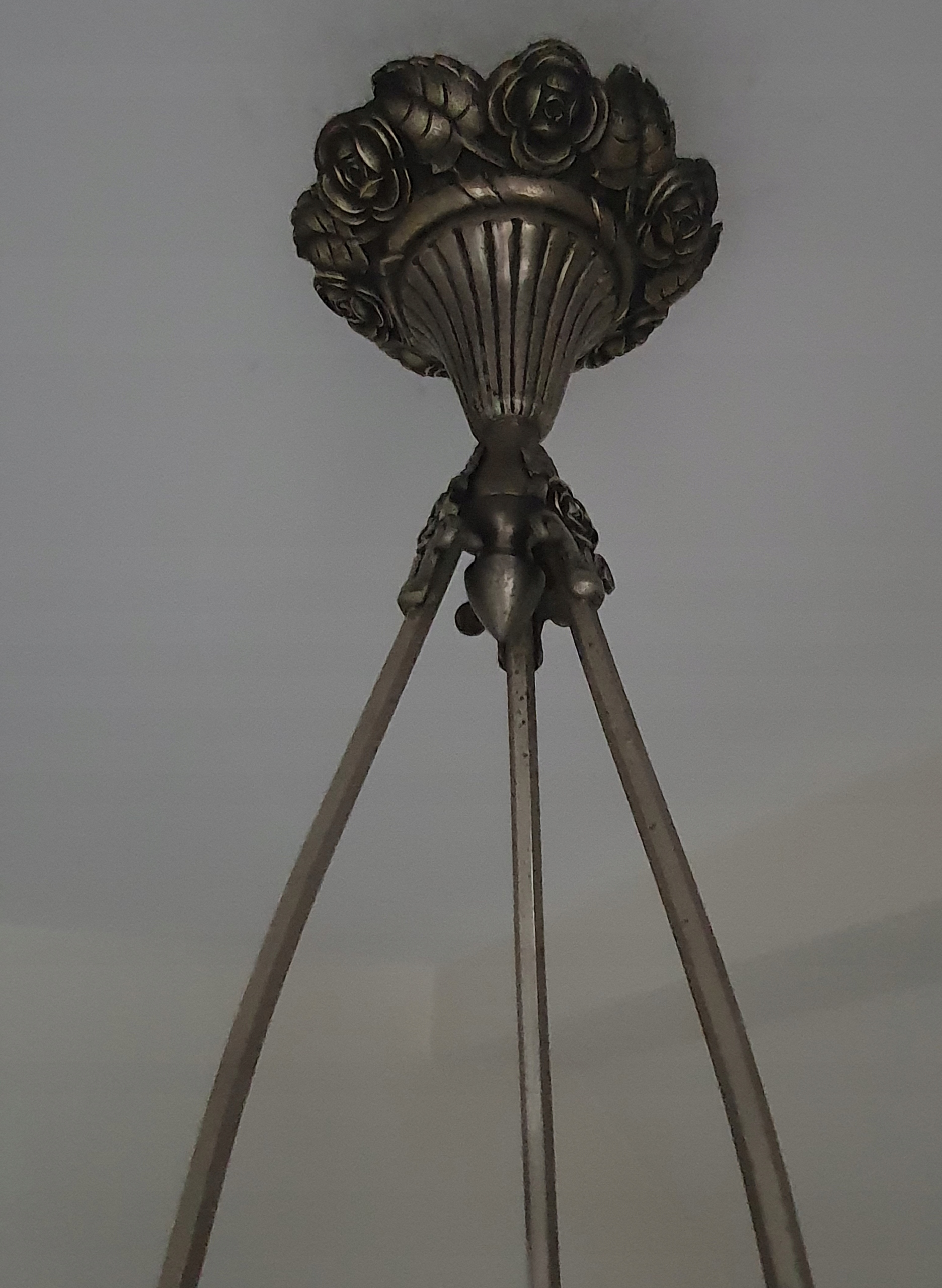 Корпус люстры выполнен из бронзы, покрытой серебряной патиной, украшен растительным орнаментом и характерными элементами стиля ар-деко. Это высококачественный предмет французского производства, декоративный, гармонично пропорциональный и полностью сохранивший дух эпохи.