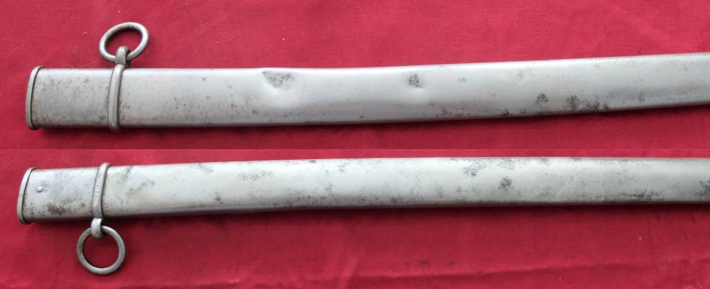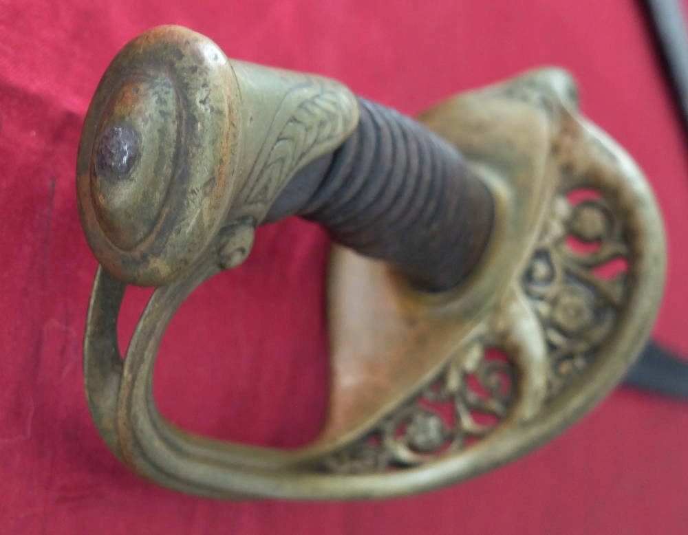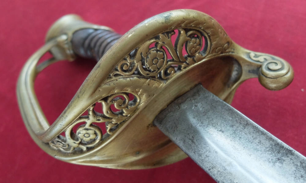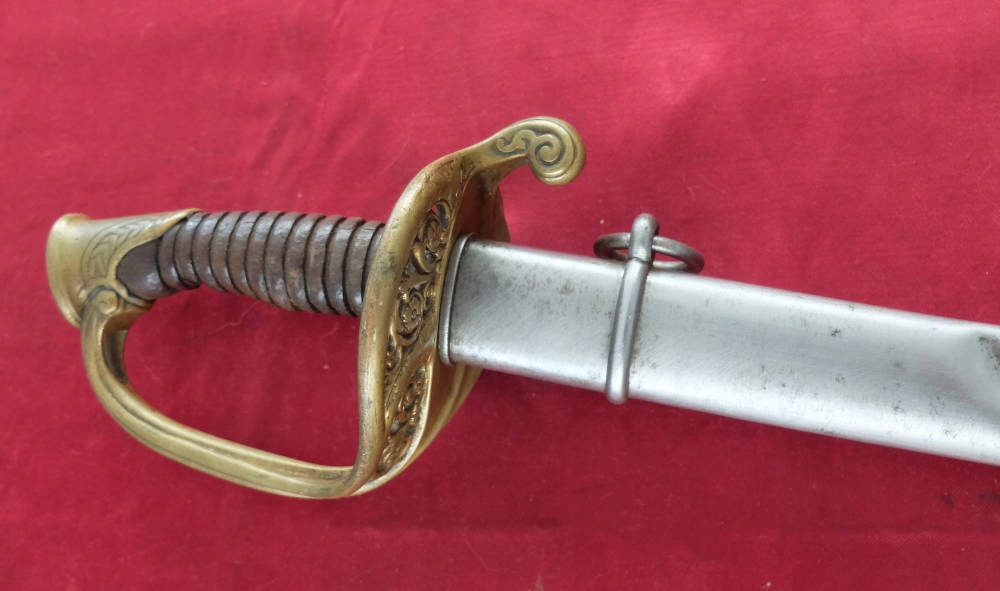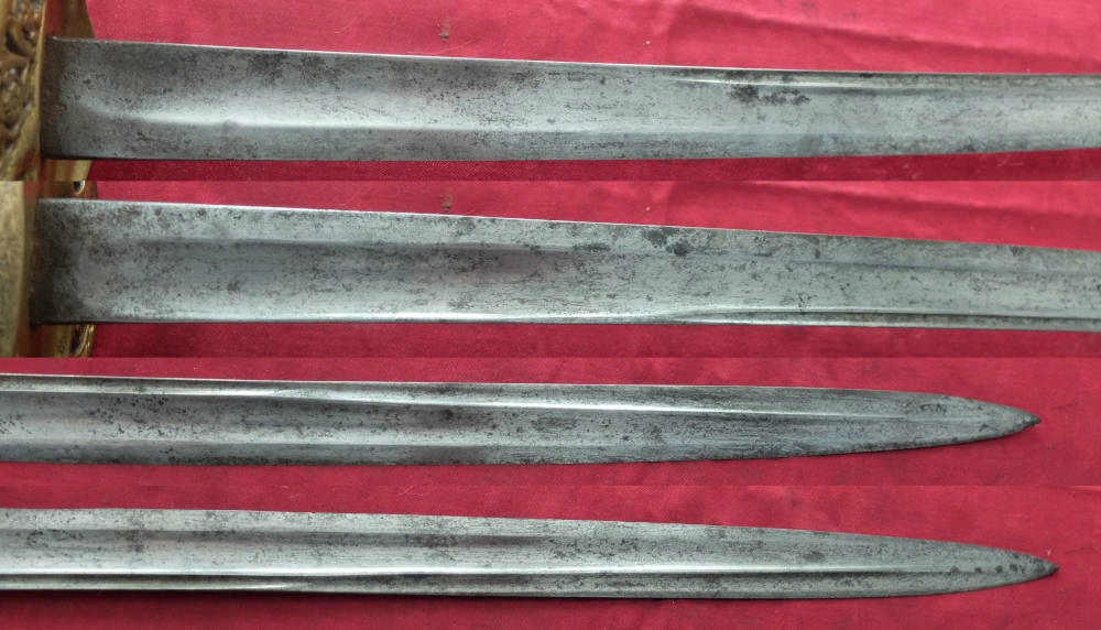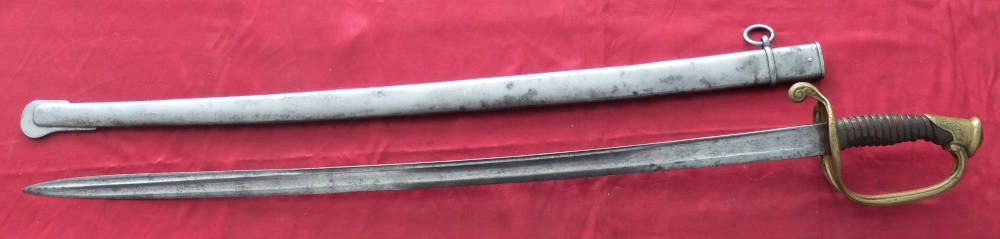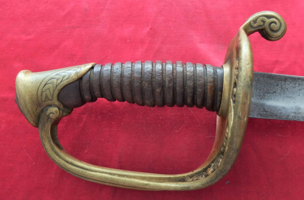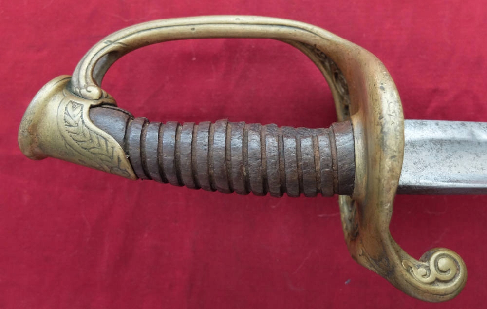 Товар виден на фотографиях. Клинок был заточен в ту эпоху и покрыт патиной. На кромке клинка имеется французская маркировка. Надпись на корешке размыта, отдельные буквы едва различимы. Каркас рукоятки латунный, стержень роговой. Сабля не сломана, люфтов нет.