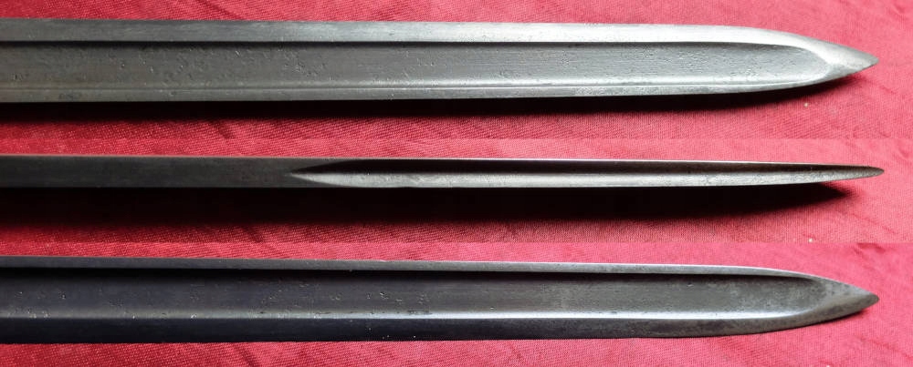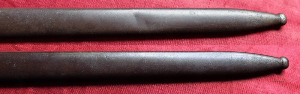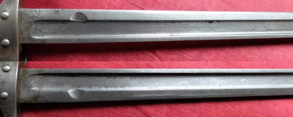 Копия видна на фотографиях, прекрасно сохранилась. Лезвие не заточено, слегка заточено. На кромке клинка имеется французская маркировка (не очень четкая). Накладки на ручки пластиковые, оригинальные. На одном видна трещина. Байонетный замок рабочий. На перекладине выбит номер 54087.
