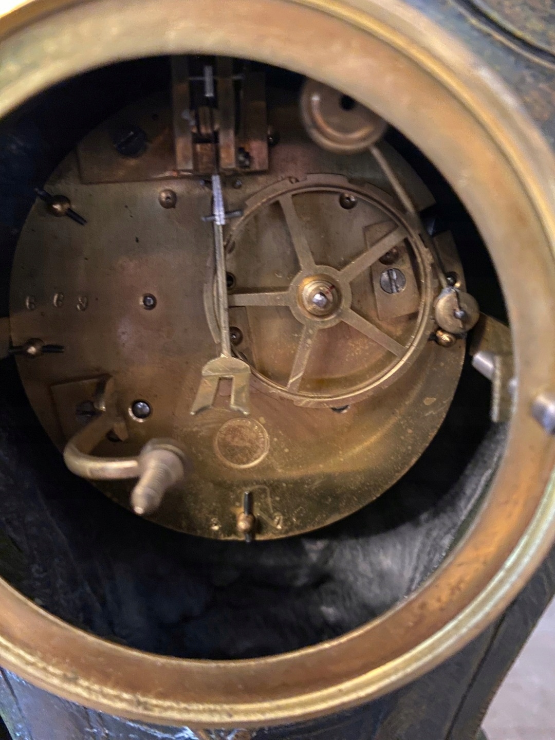 Циферблат механизма выполнен из фарфора и находится в очень хорошее состояние. Маятник и ключ в комплекте.