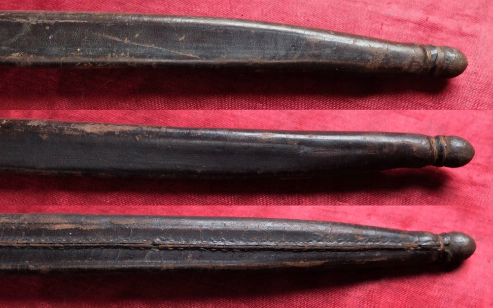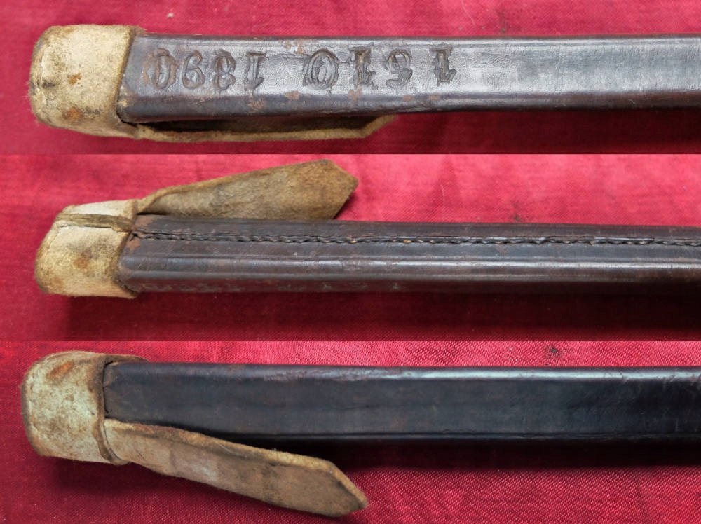 Ножны кожаные, кожа в очень хорошем состоянии. Он твердый, не треснутый. Номера выбиты на коже. Шов оригинальный. Штык хорошо помещается в ножнах. Длина ножен 47,7 см.