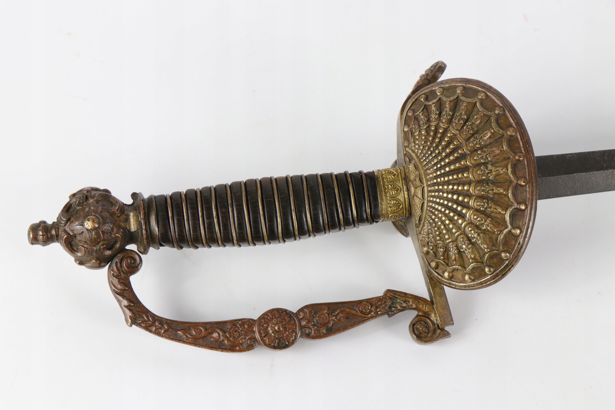 Французский придворный служебный меч начала XIX века, около 1800 года, периода Империи. Закрытая ручка, очень точное литье из оригинальной позолоченной бронзы, очень точное литье. Щит и перемычка лука, шаровая головка. Щит имеет интересный веерообразный орнамент. Древко изготовлено из красного дерева. Украшение типичное для периода Империи. Стальной клинок у основания клинка, подпись AO