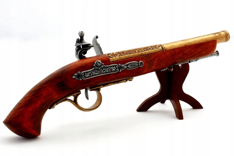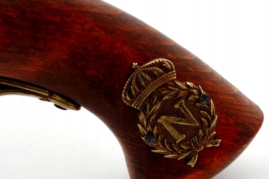 Рок -пистолет - это своего рода короткое огнестрельное оружие, самое популярное на рубеже 17 и 18 веков. Реплика, изготовленная в сочетании дерева и металла - алюминиевого цинкового сплава. Реплика очень верно отражает уникальность этого оружия. Элегантный внешний вид, сочетание простоты с сложным украшением в виде знака Наполеона на колбе с оружием. Реплика содержит все детали оригинала. В то же время это совершенно безопасно - это позволяет вам сделать сухой выстрел, неспособность заряжать оружие. Механизм реплики не воскресит искру! Отличное производство хорошо известной и ценной испанской компании Denix. Версия изготовлена в золоте - серебро, на другом аукционе, доступном только в серебре. Реплика, изготовленная в левой версии, на последней фотографии показала возможность пересечения другой правой версией -кирпичный эффект !!!