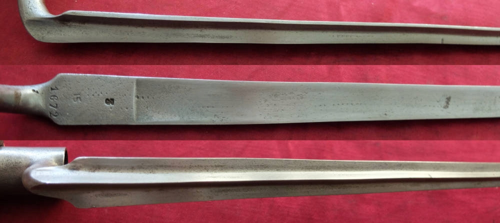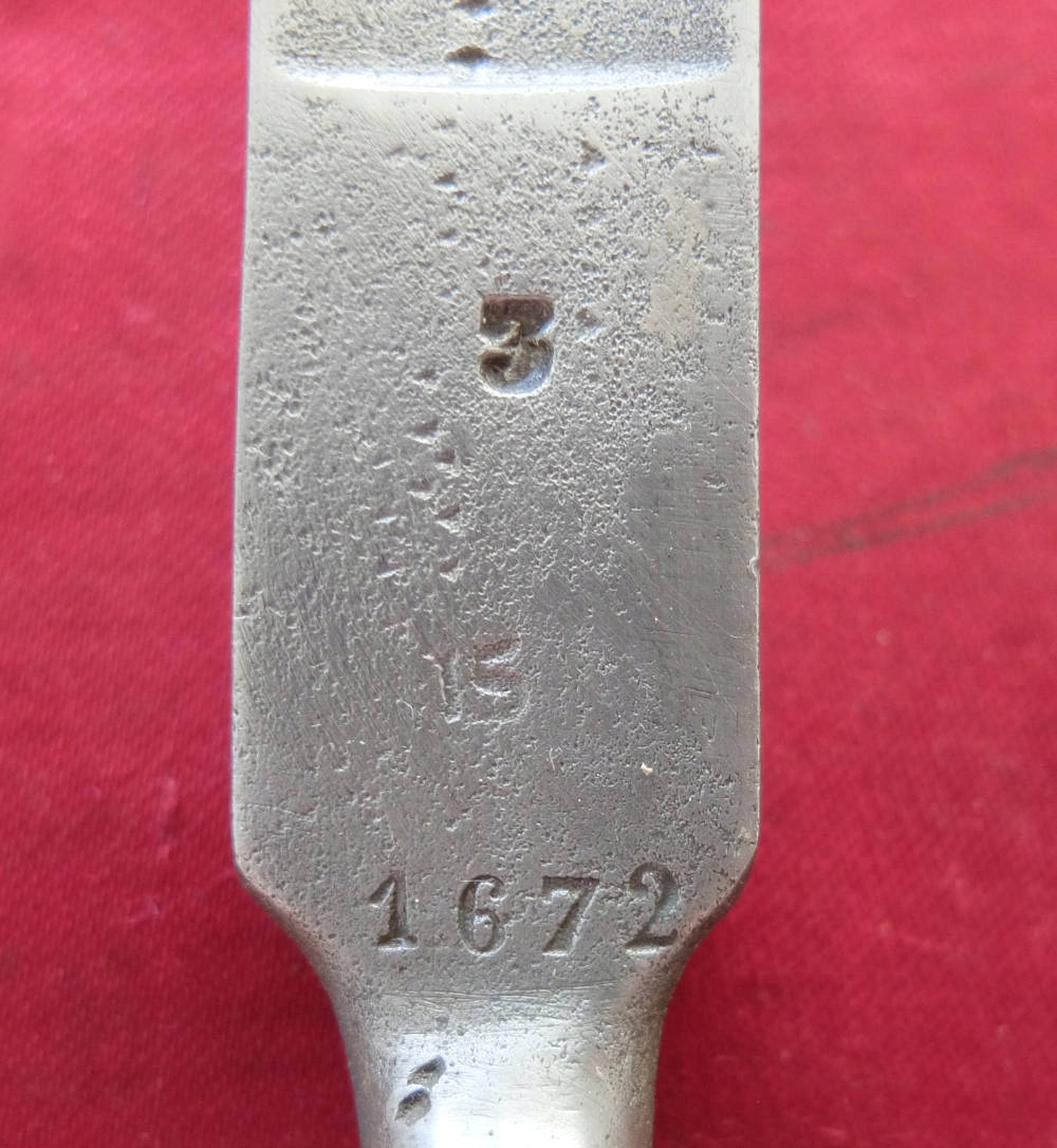 Предмет виден на фотографиях, в хорошей сохранности. На пороге клинка и плече видны подписи, в том числе: номер 1672. Лезвие слегка отполировано. Кольцо подвижное. Ручка слегка изогнута, как видно на фотографиях.