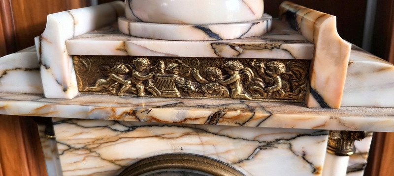 Каминные часы с двумя насадками. Изготовлен из разноцветного мрамора, что в целом создает чудесный эффект; по обеим сторонам колонны отделаны латунным декором, над циферблатом и под колоннами - латунные вставки с мотивами амура. Часы сделаны с вниманием к деталям. Круглый циферблат с арабскими цифрами расположен за выпуклым стеклом, обрамленным латунной рамкой. Механизм работает по принципу маятника, шагающего типа.