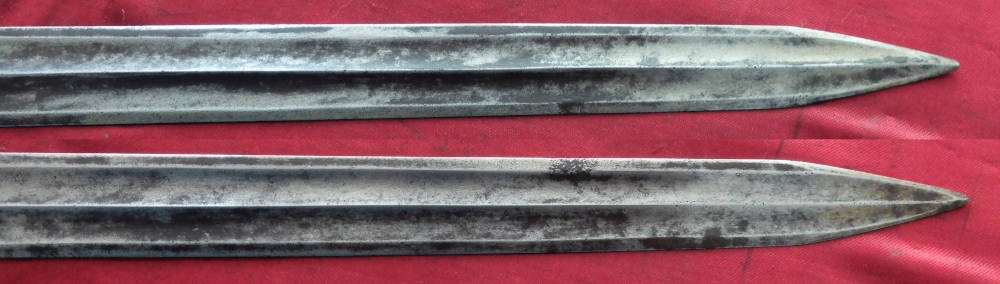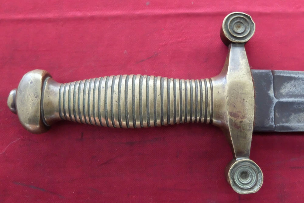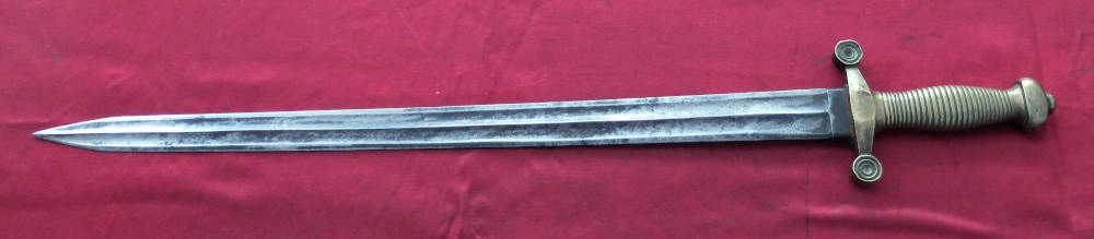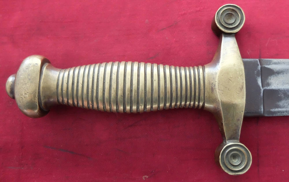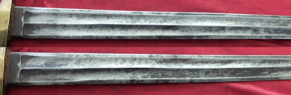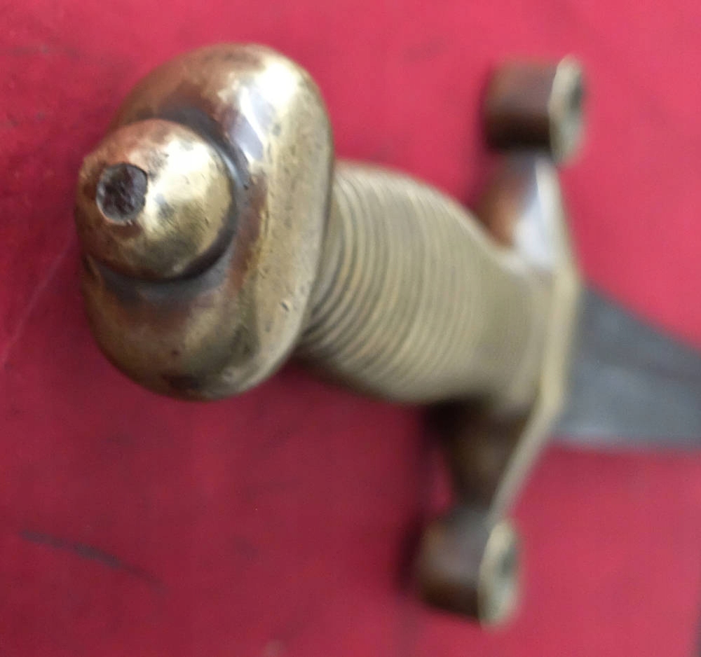 Экземпляр виден на фотографиях, хорошо сохранился. Клинок неполированный, возможно, заточенный в ту эпоху, покрыт темным неровным налетом. Лезвие слегка изогнуто. Под перекладиной сохранилась оригинальная красная ткань. Рукоять изготовлена из латуни, имеет небольшой люфт.