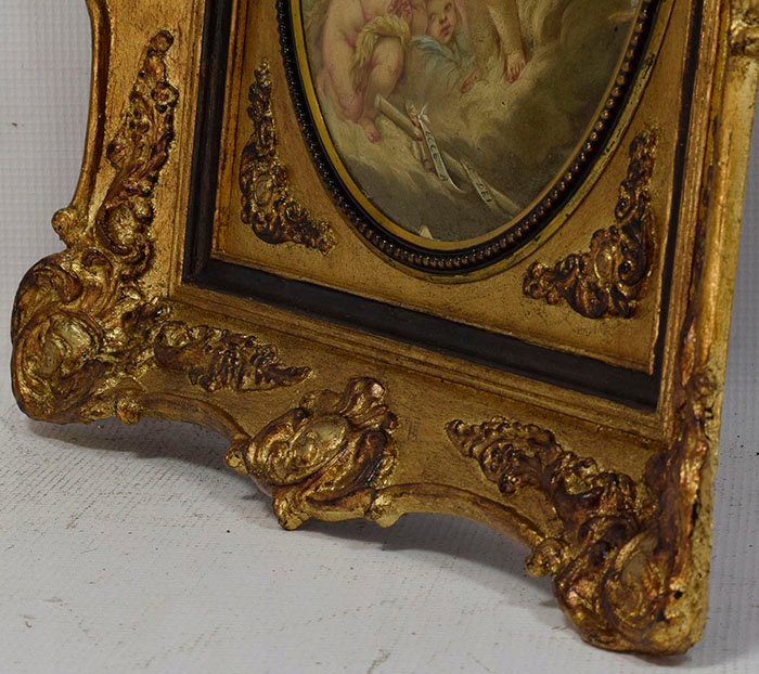 Красивая старинная картина маслом, написанная на доске, изображающая Младенца Иисуса, благословляющего Святого. Иоанн Креститель. На ленте написано «Ecce Angus Dei». Авторство картины приписывают Франсуа БУШЕ (1703-1770).