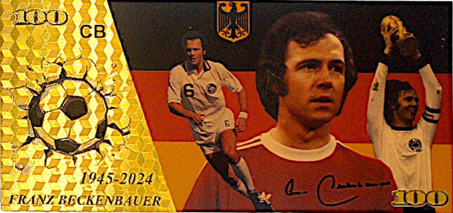 Это уникальная возможность для любителей коллекционирования редких и эксклюзивных нумизматических предметов! Представляем уникальную позолоченную банкноту с изображением легендарного футболиста и тренера Франца Беккенбауэра.