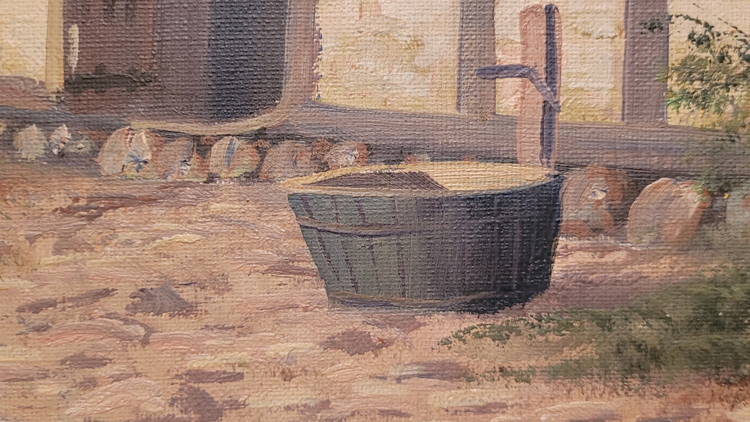 Объект продажи - красивая старая нефтяная картина "Старые постройки".