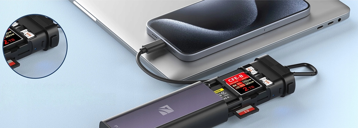 Путешествуйте налегке с нашим многофункциональным устройством считывания карт и держателем. Поддерживает карты CF Express A/B, SD и TF, что упрощает передачу данных в дороге. Идеальное решение для мобильных профессионалов.