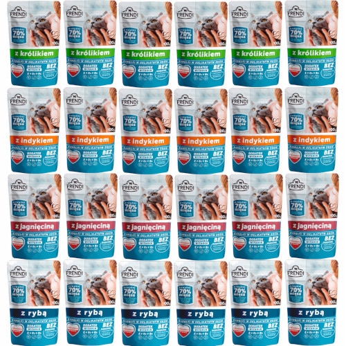 Frendi с кроликом 100г: мясо и продукты животного происхождения (75% мяса и продуктов животного происхождения, мясо животных в кусках, 4% кролика), крупы, минеральные вещества, экстракты растительных белков, различные сахара.