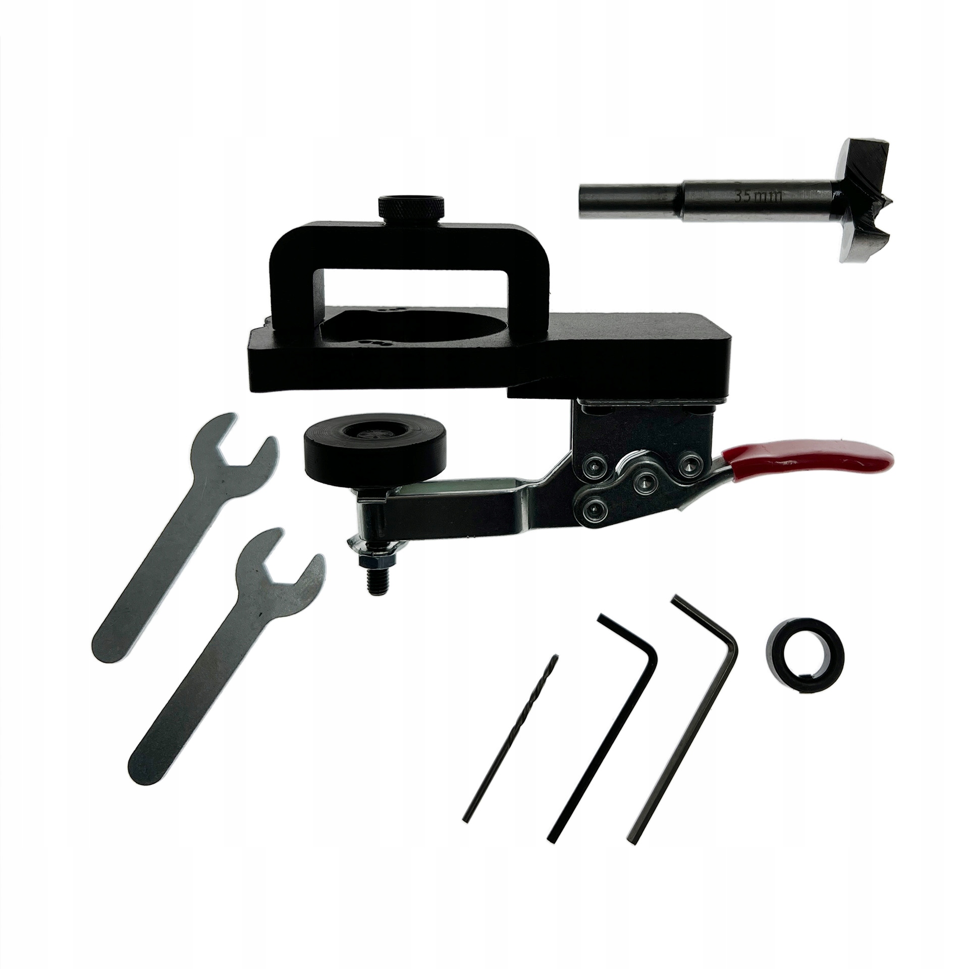 Инструмент позволяет легко и точно расположить место для петель на мебельном щитке и просверлить соответствующие отверстия для гнездо и крепежные винты.