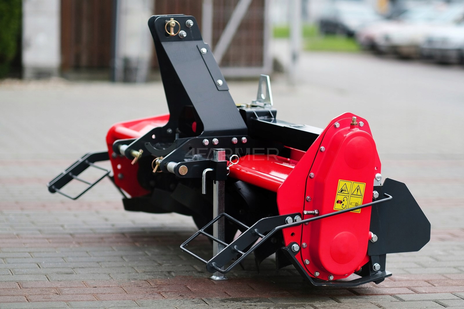 За счет вращающихся ножей фрагменты почвы вырезаются и измельчаются. Мотоблок оснащен массивными изогнутыми вбок ножами, которые тщательно перемешивают почву. Они установлены на рабочем валу по 4 штуки на каждой секции, всего 28 штук. Ширина нашей работы 125 см, а глубина, на которой мы можем работать, 8 – 12 см. Чтобы мотокультиватор работал исправно и выполнял свою задачу, его следует использовать с трактором рекомендуемой мощности не менее 18 л.с. Благодаря этому мы получим правильно подготовленную почву для последующих работ.
