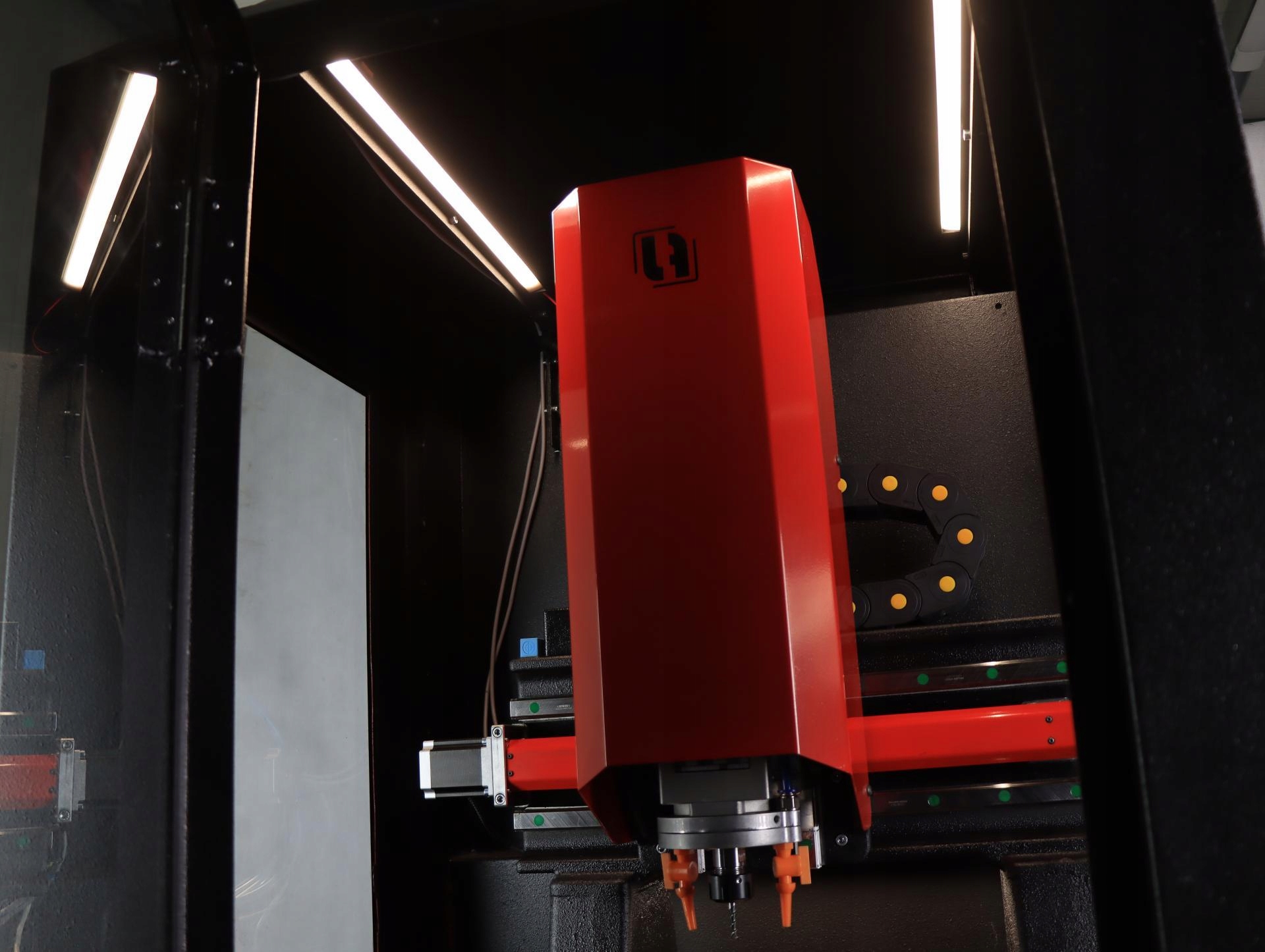 - Освещение: Станок имеет светодиодное освещение на шпинделе, под воротами и в верхней части корпуса.