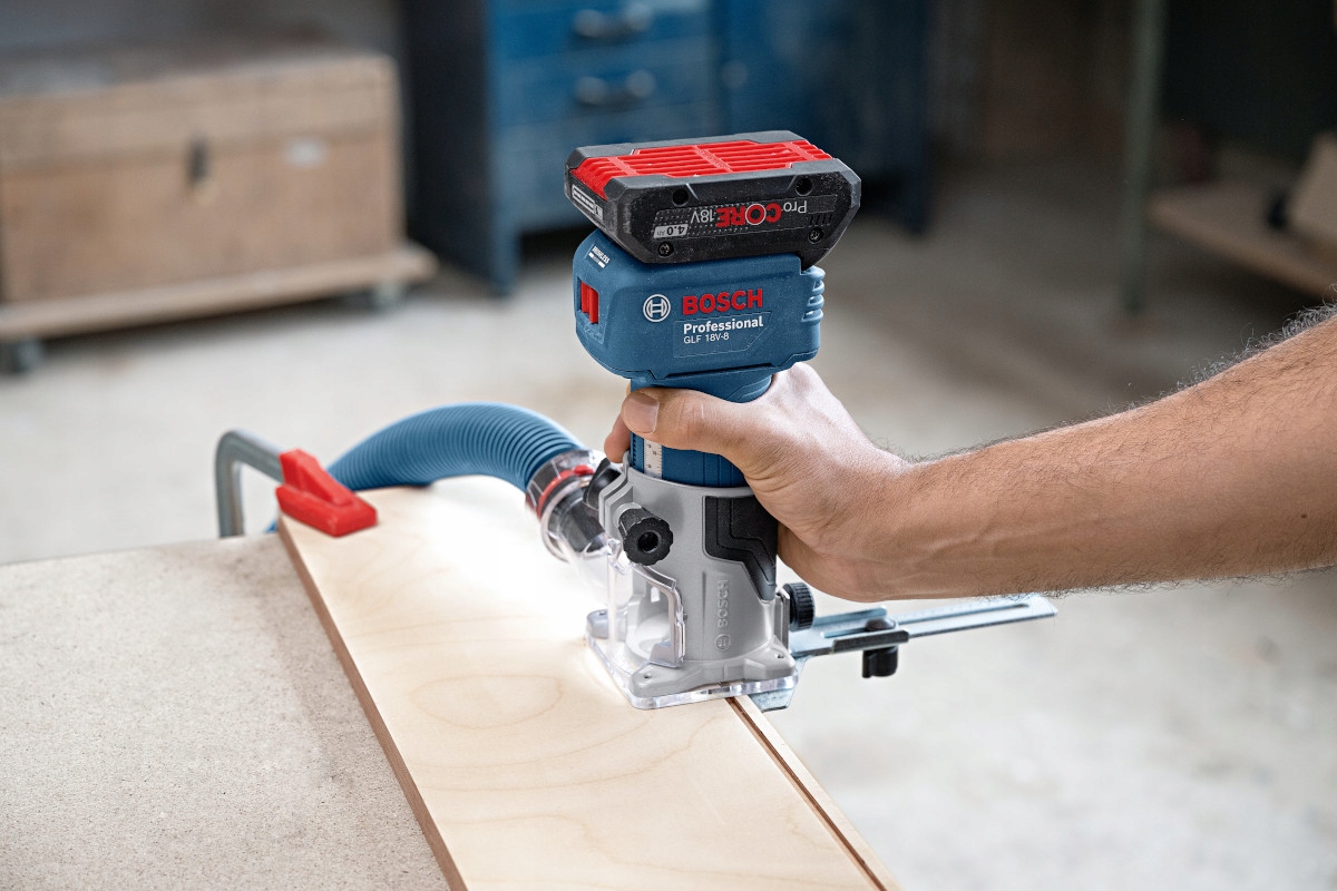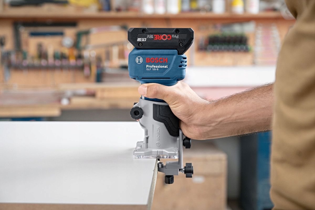GLF 18V-8 — один из самых популярных фрезерных станков BOSCH, предназначенный для фрезерования пазов, продолговатых отверстий, кромок и профилей в древесине, пластмассах и легких строительных материалах, а также для копировального фрезерования, а благодаря бесщеточному двигателю, фрезерный станок легко справится с этими и другими задачами.