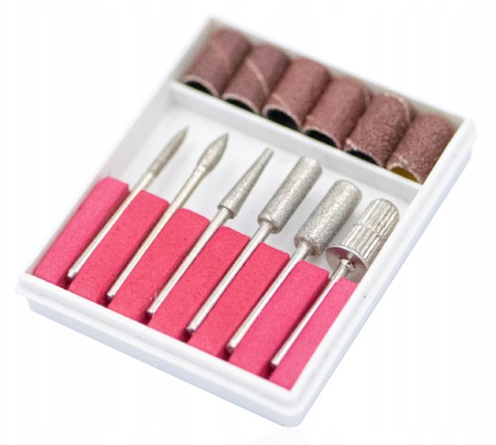 Набор фрез в комплекте - цилиндрические, игольчатые, конические, полировальные и абразивные насадки - для полноценного маникюра и педикюра.