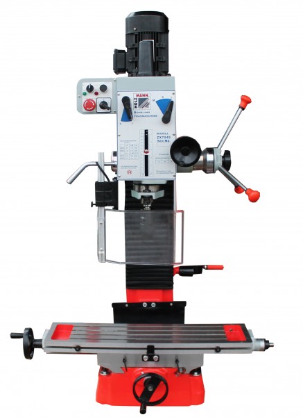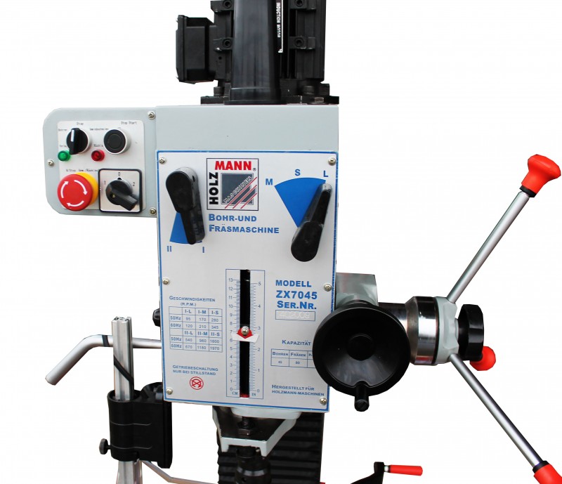 - Подача втулки шпинделя посредством трехплечего рычага и прецизионного маховика со шкалой глубины