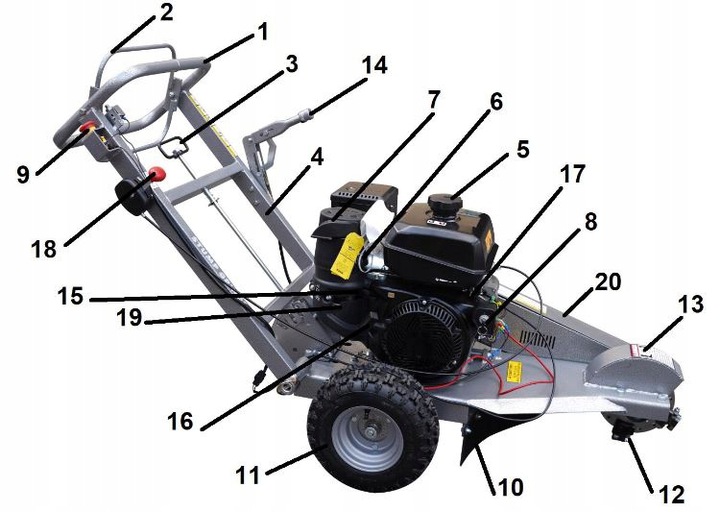 14. Тормозной рычаг – при перемещении в сторону оператора левое колесо блокируется (убедитесь, что тормоз