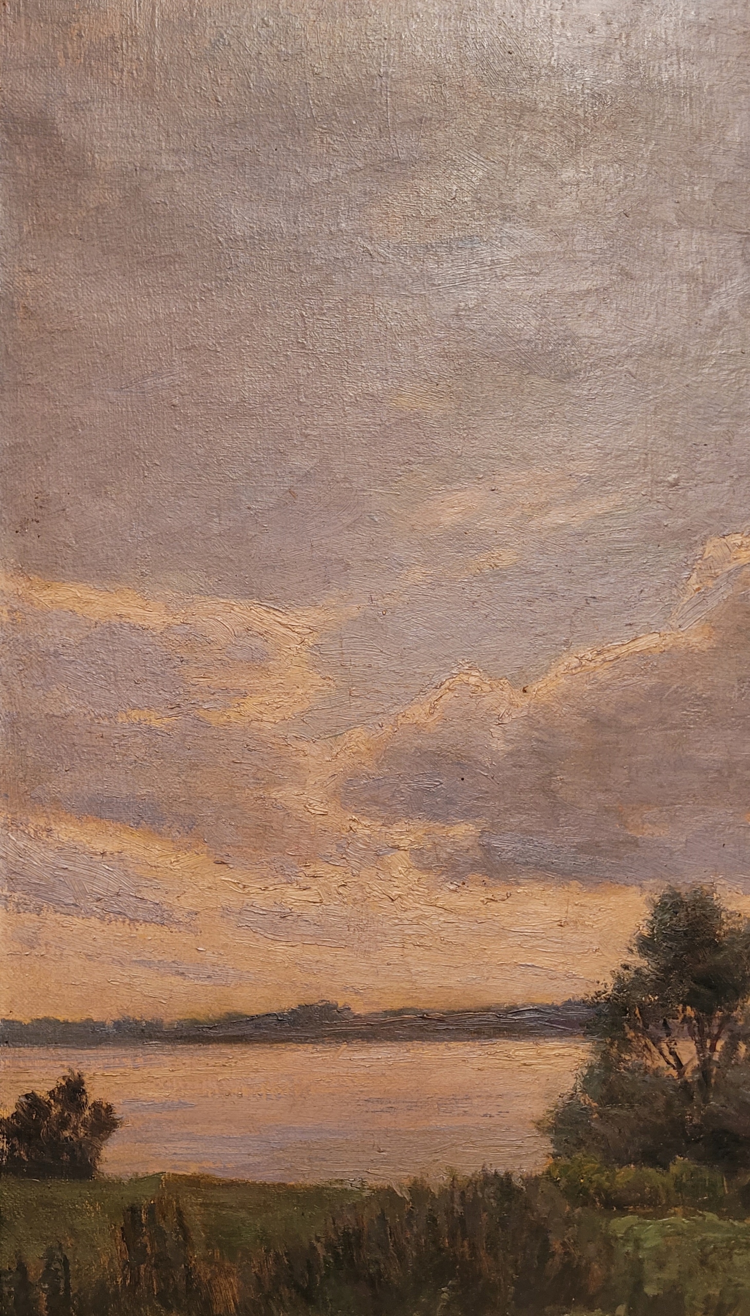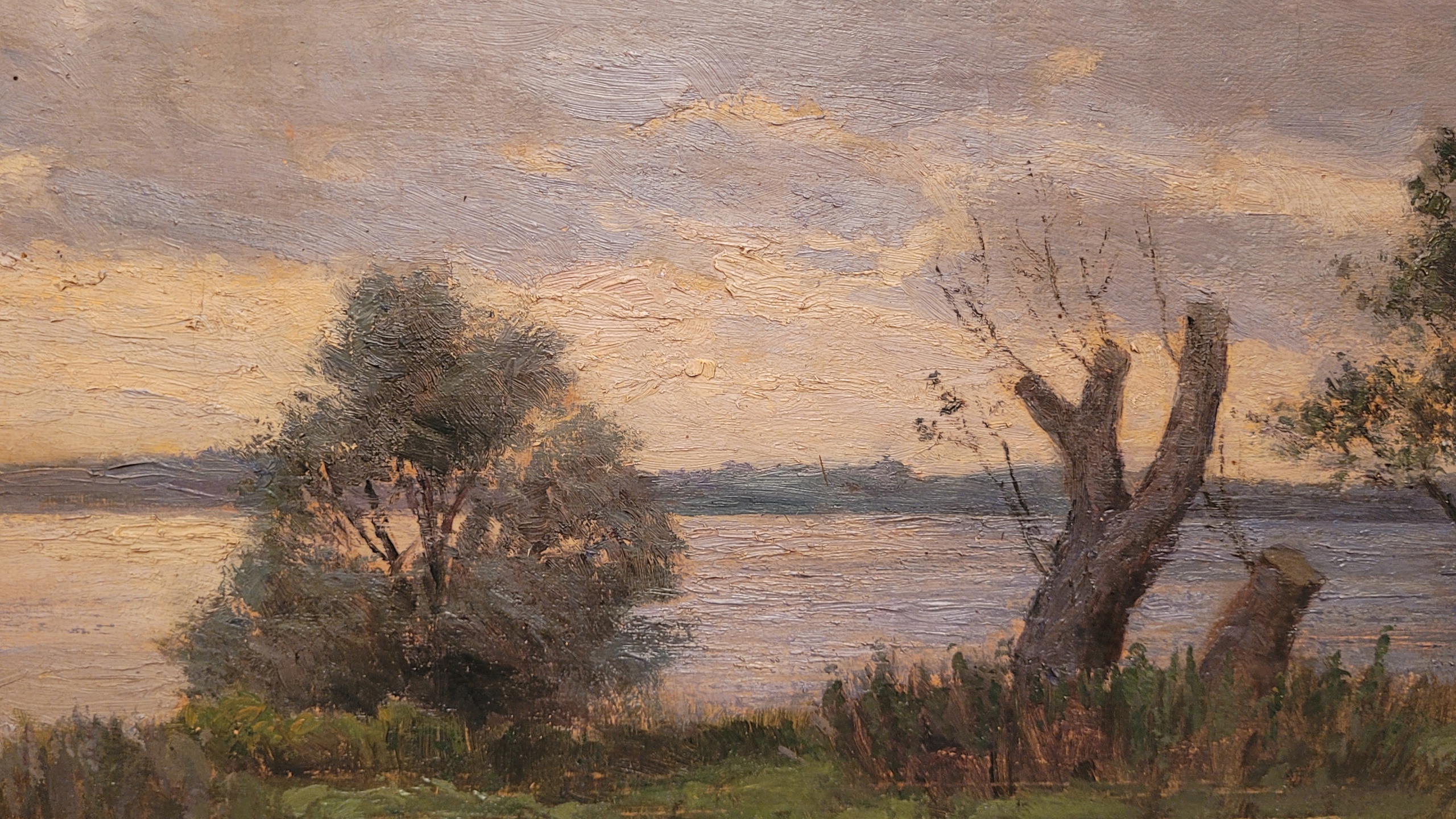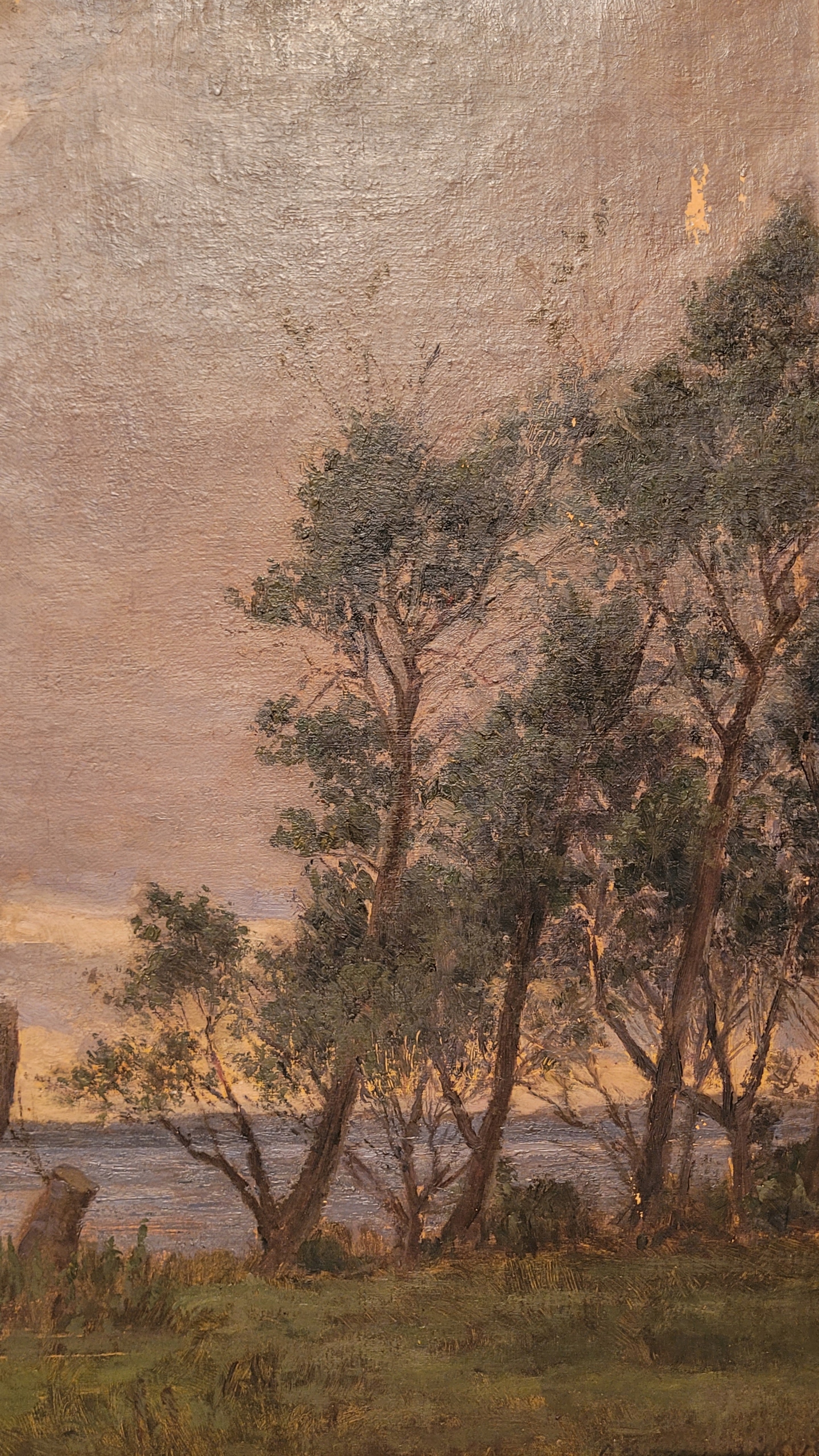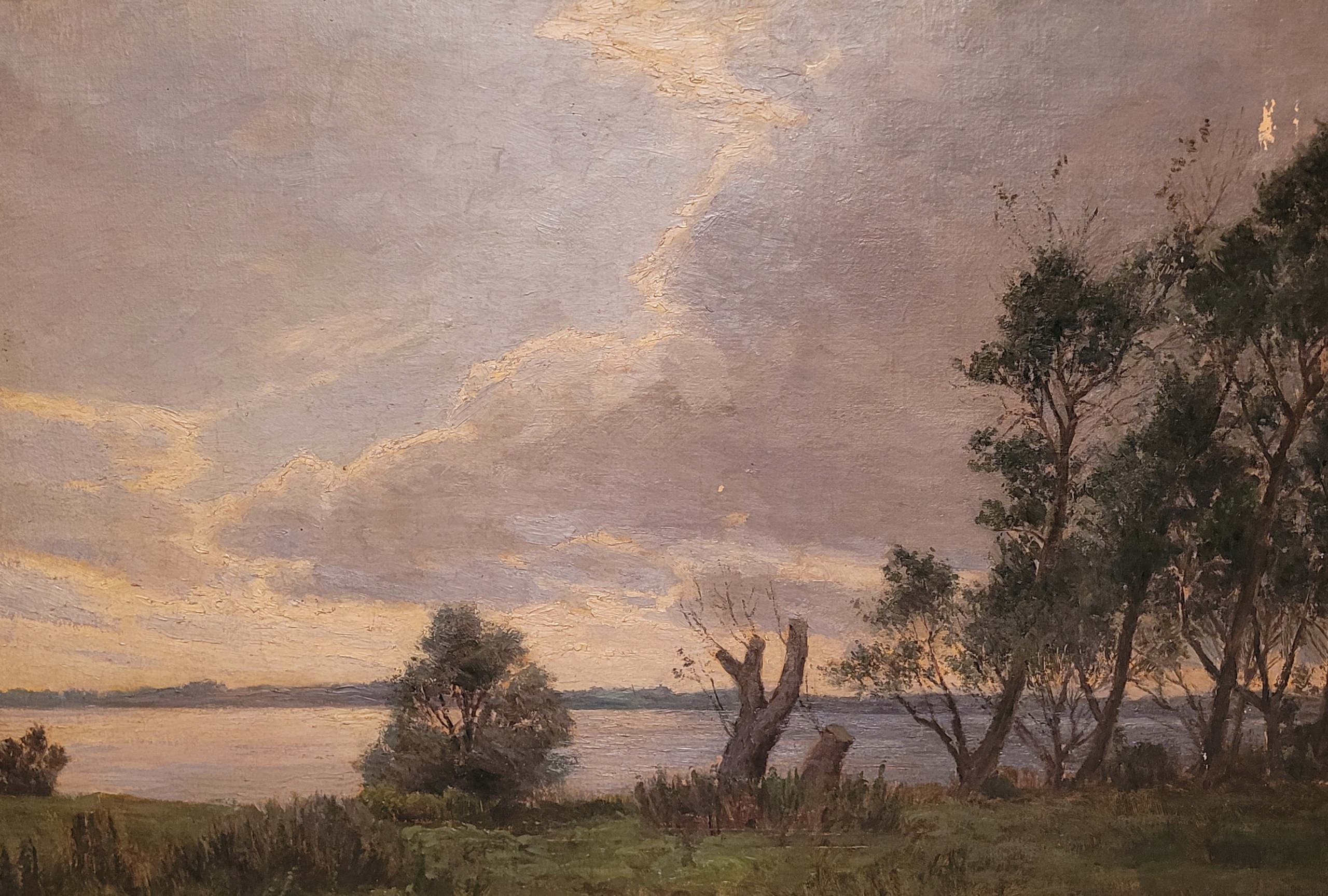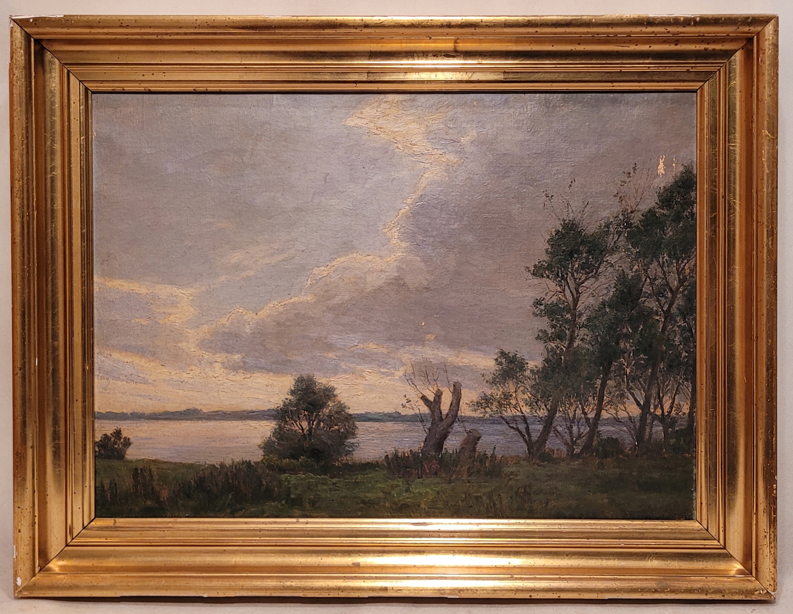 Предмет продажи - красивая, старинная картина маслом "ТРОЕ У ОЗЕРА".