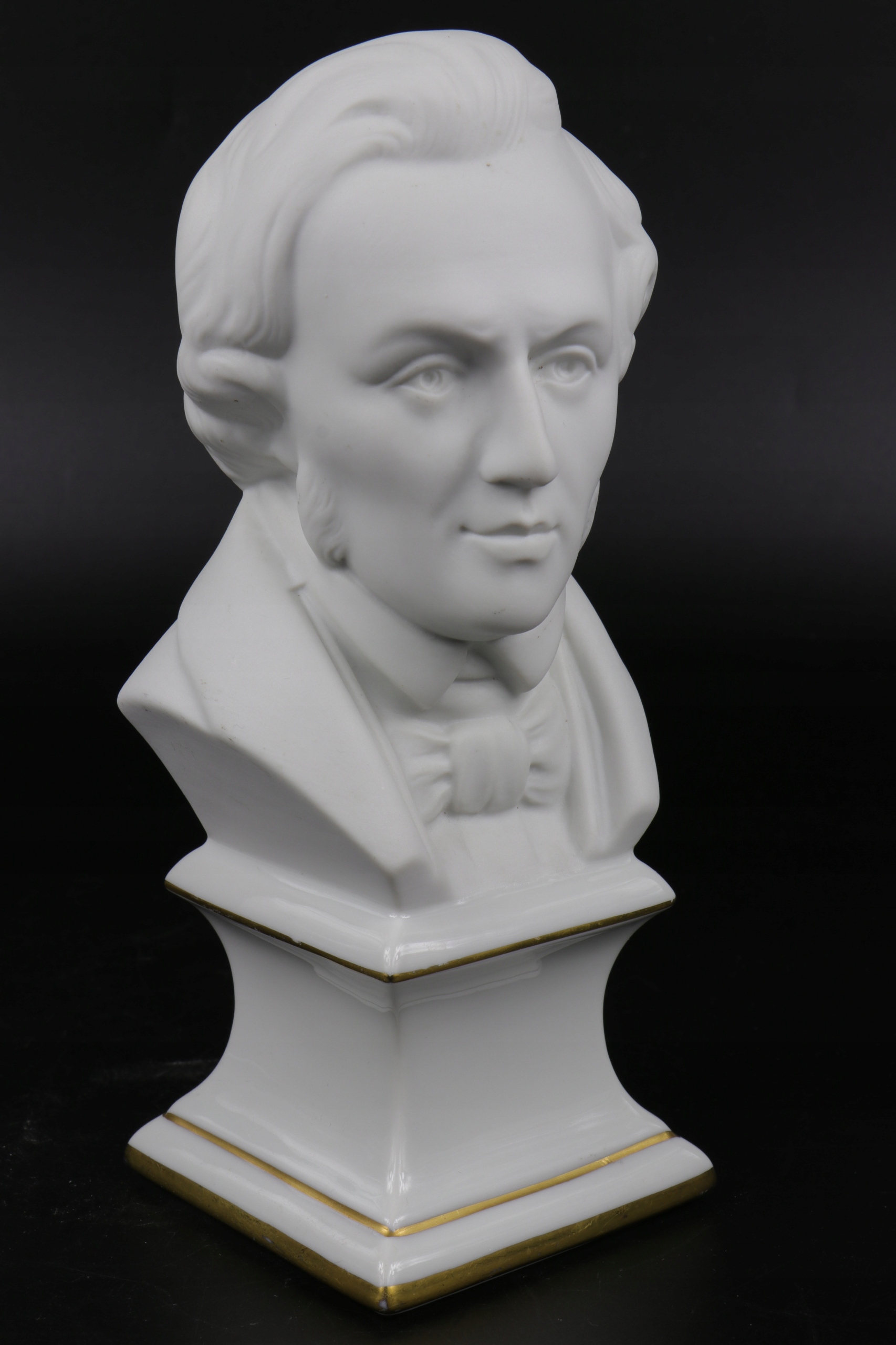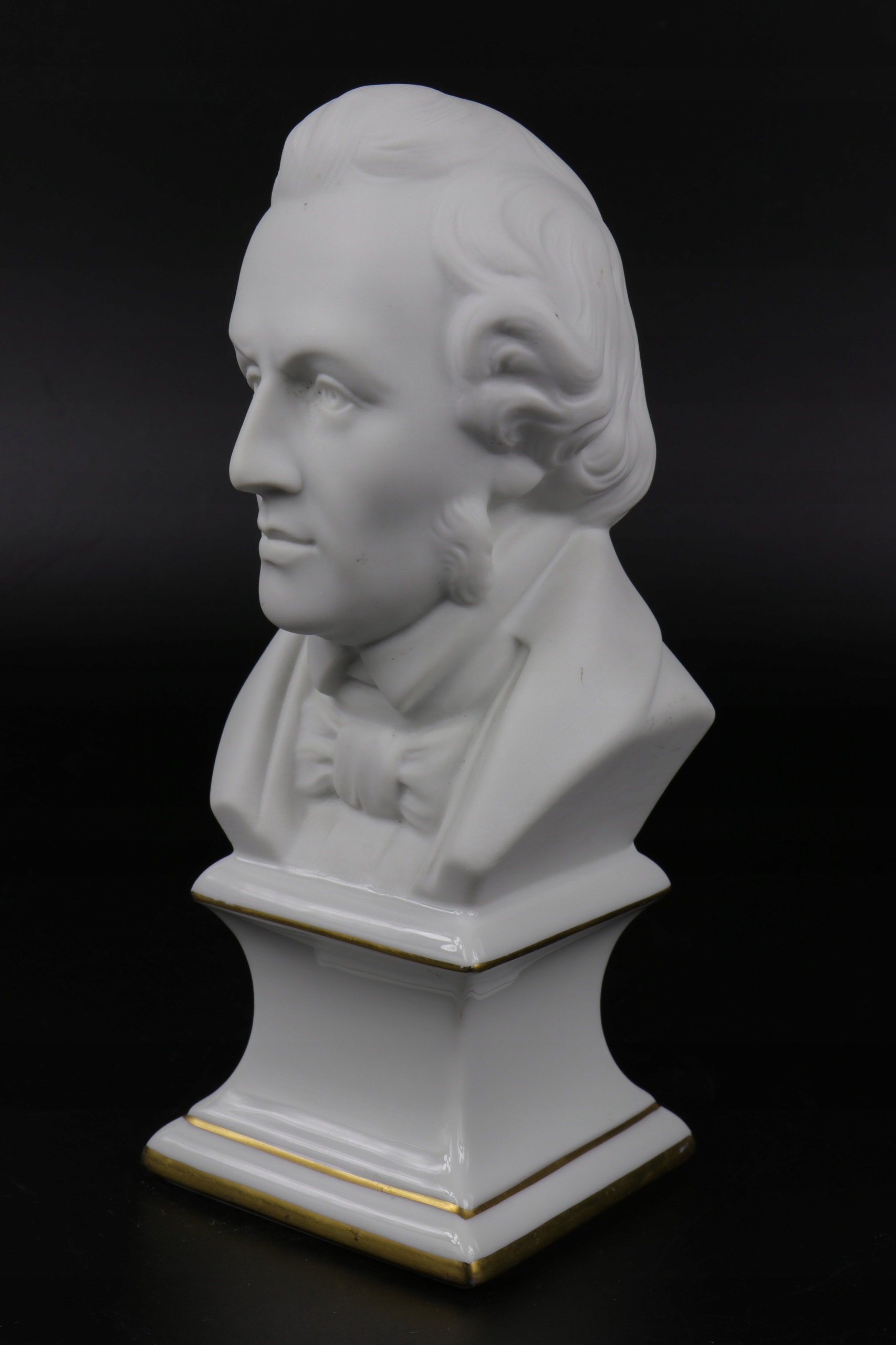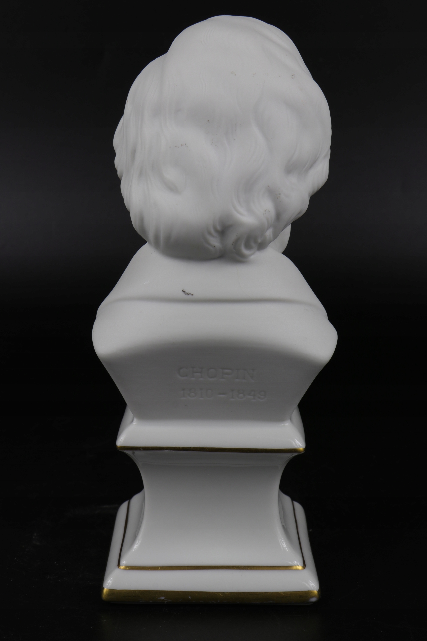 Бисквитный бюст Фридерика Шопена, установленный на глазурованном фарфоровом постаменте. Очень хорошо смоделировано лицо Шопена.