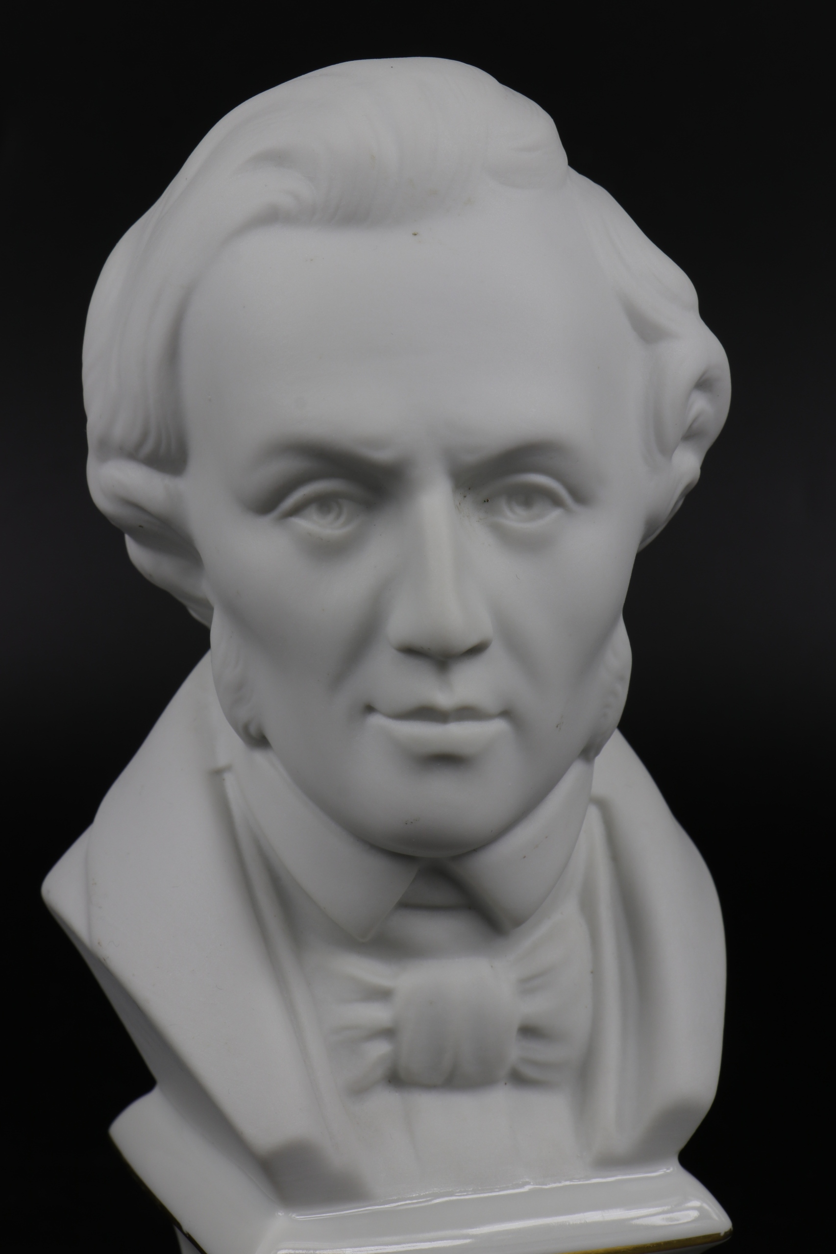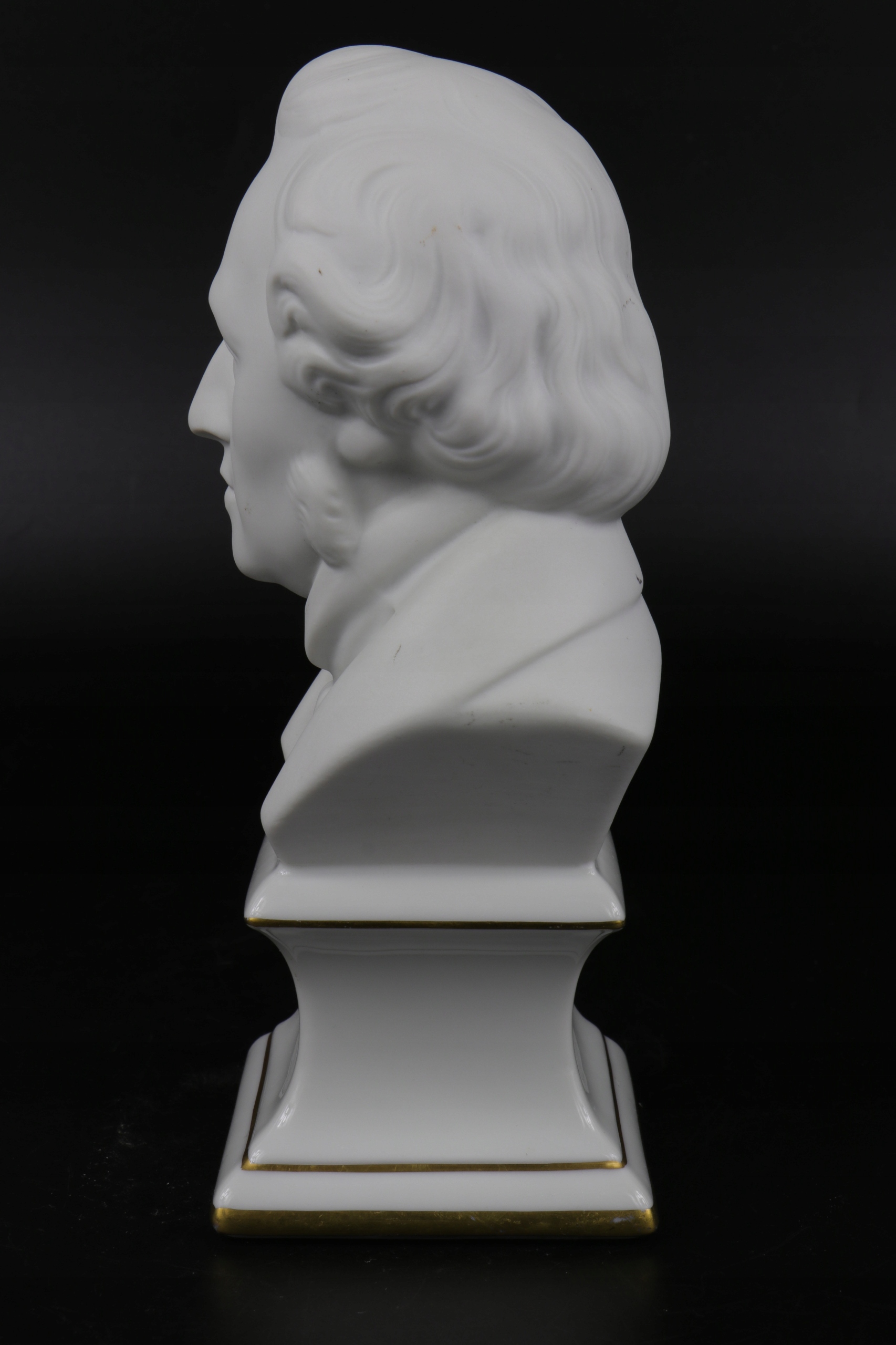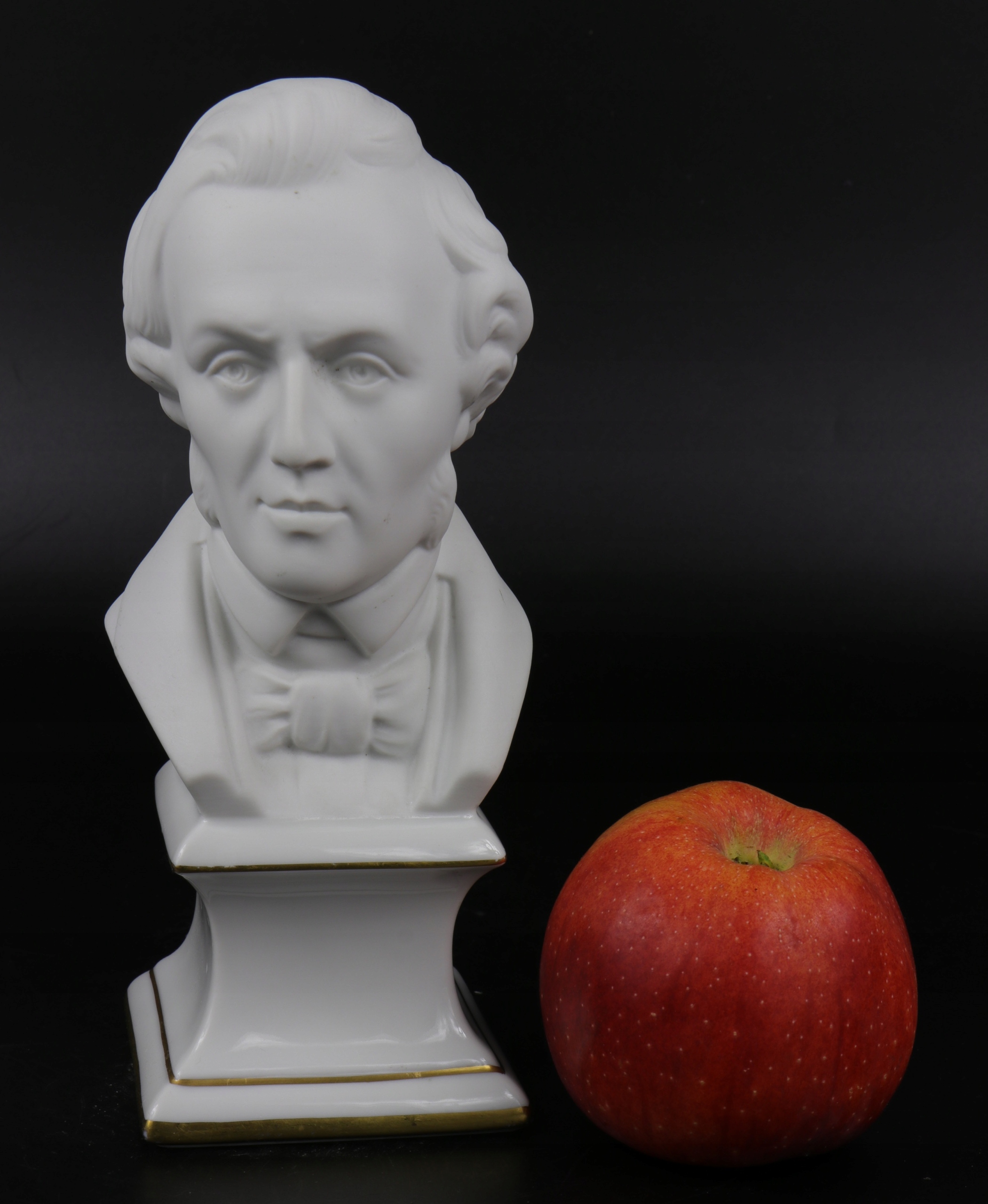 Бисквитный бюст Фридерика Шопена, установленный на глазурованном фарфоровом постаменте. Очень хорошо смоделировано лицо Шопена.
