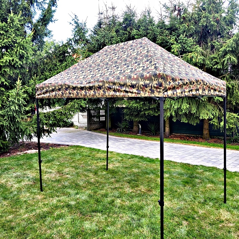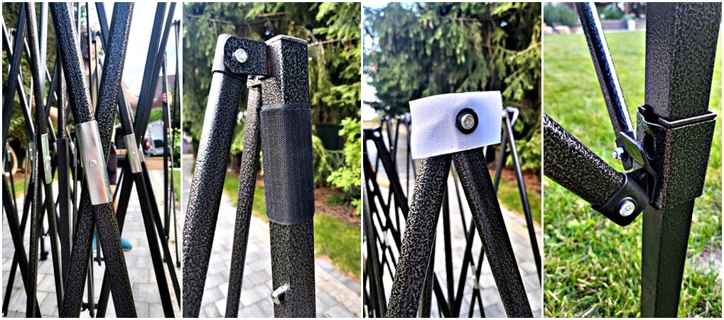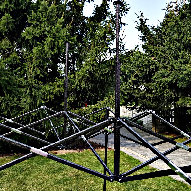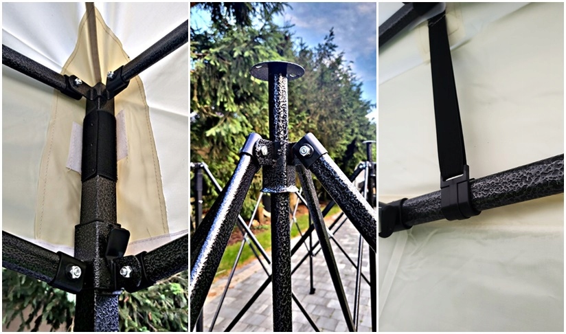 Рама палатки изготовлен из стали с порошкой, состоящей из квадратных профилей. Экспресс -спреда. Система SNAP облегчает сборку и разборку и регулировку высоты складного павильона. Дополнительным преимуществом является металлическое подкрепление рамы. У каждой ноги есть нижний колонтитул с возможностью прикрепить сельдь в ней. Защитная крышка прикреплена к раме.