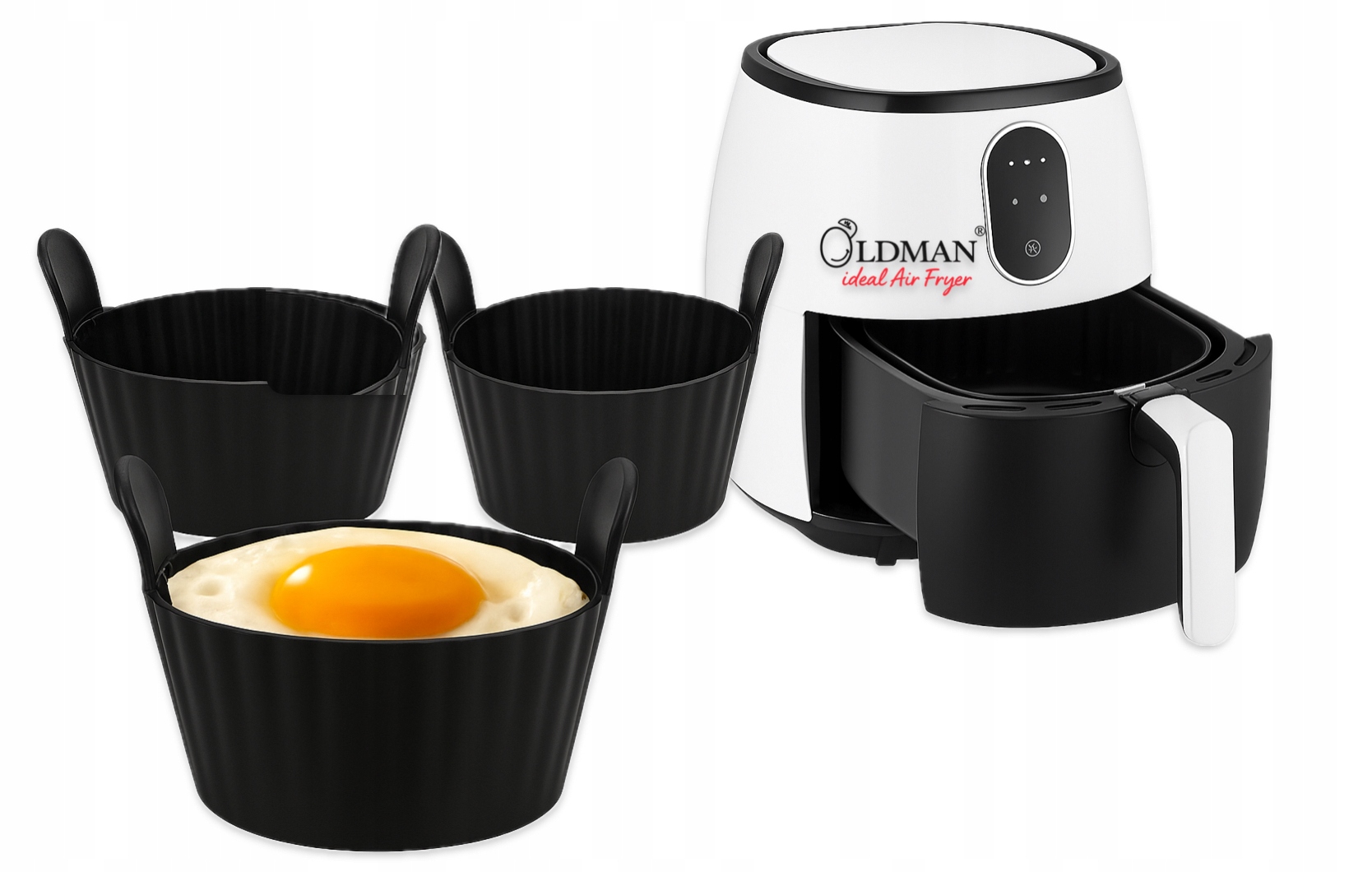 Идеален для использования в обезжиренной аэрофритюрнице. Черные гладкие формы с ручками.