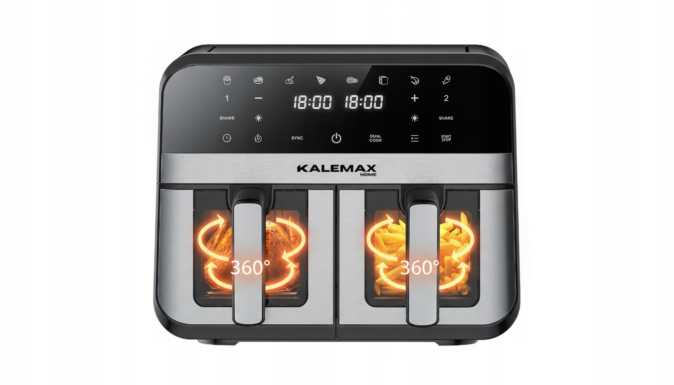 Обезжиренная фритюрница KALEMAX — современное устройство для всех, кто хочет питаться здоровее, не жертвуя при этом вкусом. Благодаря циркуляции горячего воздуха на 360° блюда отлично пропекаются, становятся хрустящими и ароматными - без необходимости использования масла.