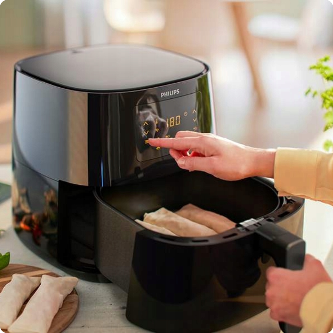 Устройство чрезвычайно универсально — оно заменяет несколько кухонных приборов, поскольку позволяет жарить, запекать, готовить на гриле и разогревать пищу. Встроенная сенсорная светодиодная панель оснащена7 готовыми программами, которые автоматически выбирают время и температуру для таких блюд, как картофель фри, мясо, рыба, овощи, курица, пирожные и закуски.