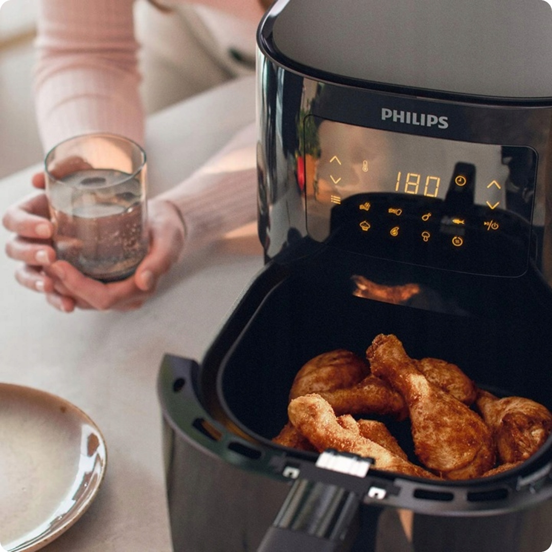 Аэрофритюрница Philips — это устройство, предназначенное для приготовления здоровой пищи. Благодаря технологии Rapid Air вы можете жарить, запекать и готовить на гриле с минимальным количеством жира — до 90 % меньше, чем при традиционных методах жарки. Большая емкость 4,1 литра позволяет готовить блюда для всей семьи - за раз умещается до 0,8 кг картофеля фри, чего хватит на 4-5 порций.