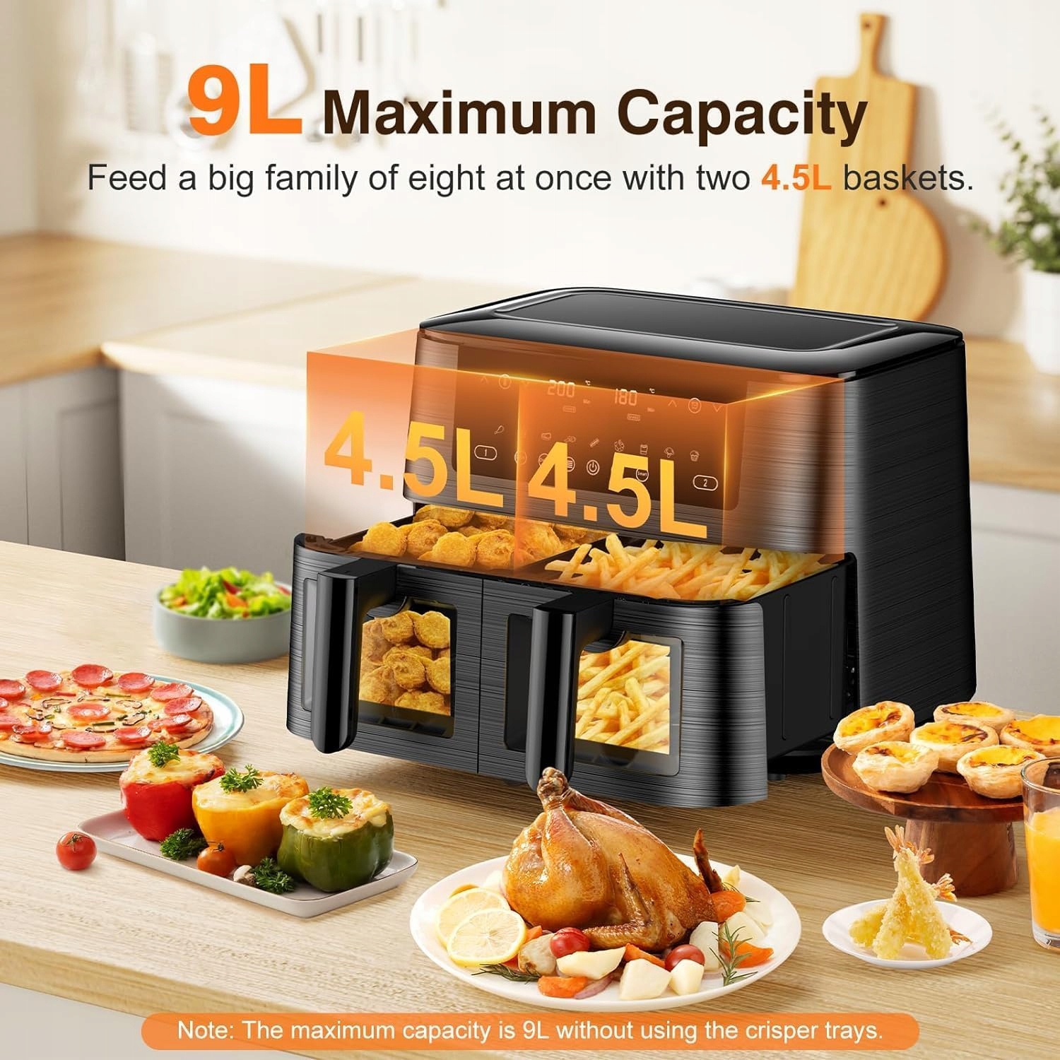 Фритюрница с двойным горячим воздухом объемом 9 литров состоит из двух корзин для жарки (максимальная емкость каждой: 4,5 литра), каждая из которых может работать независимо или вместе для приготовления различных ингредиентов.