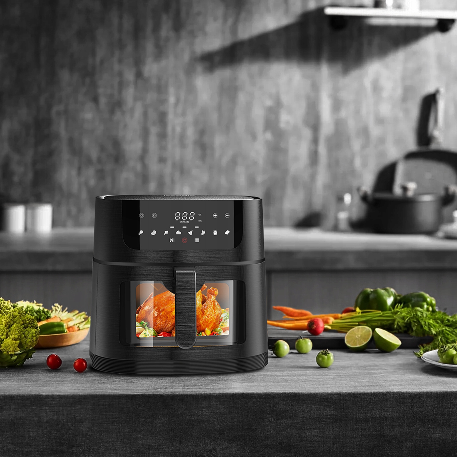 Большое прозрачное смотровое окно: Фритюрницы с горячим воздухом имеют большое прозрачное смотровое окно с внутренней подсветкой. Вы можете отслеживать статус приготовления в режиме реального времени, исключая риск переваривания и гарантируя, что ваши блюда будут приготовлены идеально и с желаемой хрустящей корочкой.