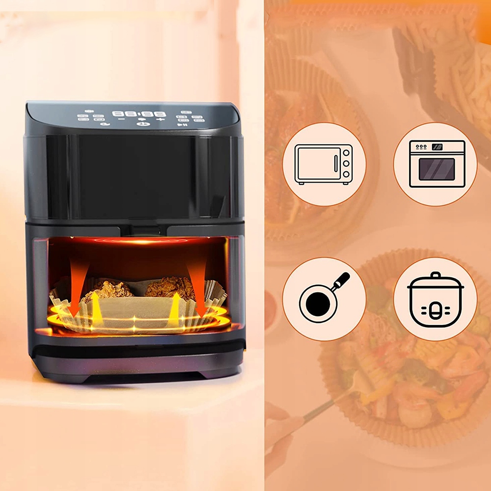 - Тепло генерируется за счет циркуляции воздуха через стенки кастрюли без ущерба для циркуляции воздуха из-за использования бумаги для жарки.