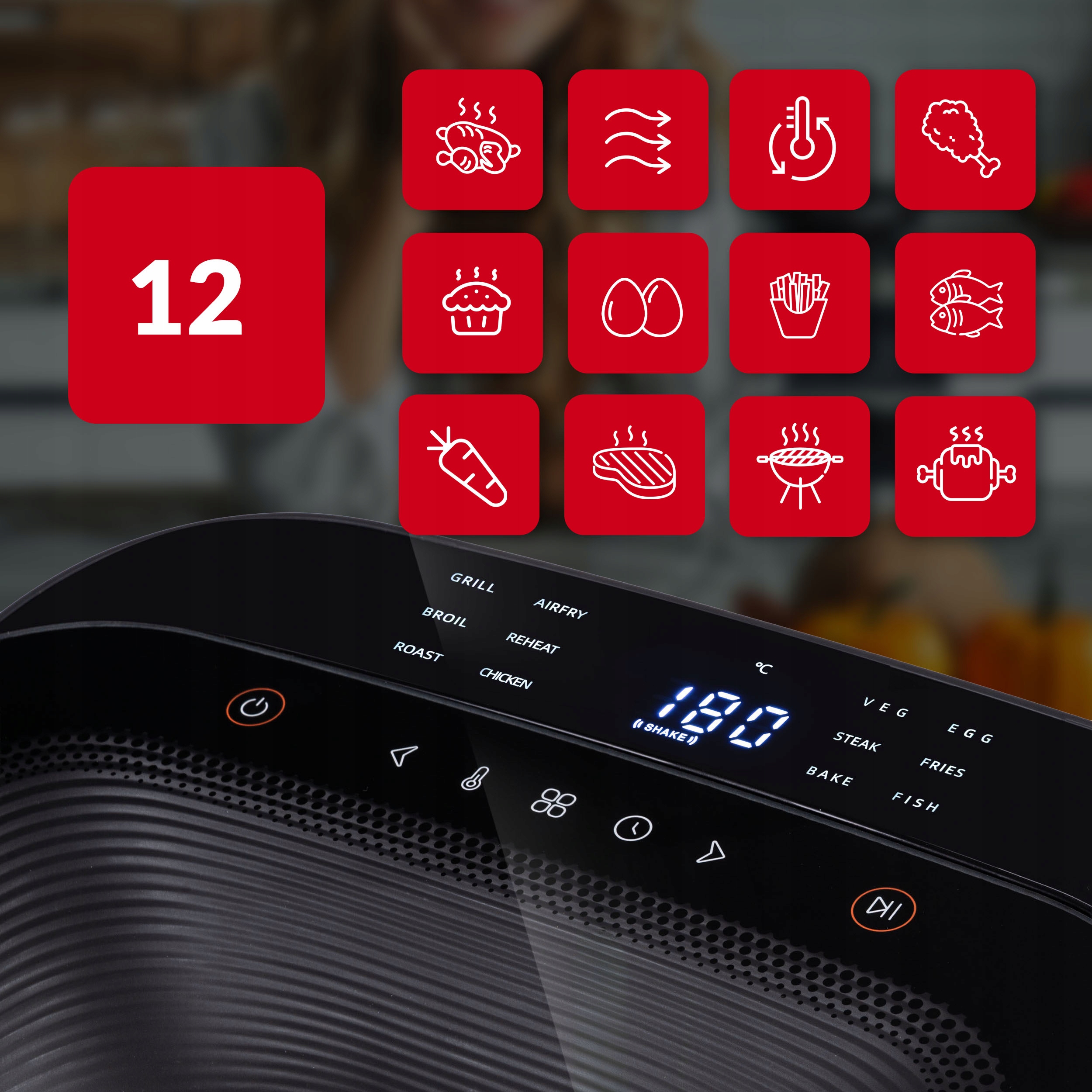 - 12 автоматических программ - устанавливает время самостоятельно. и температуры, что позволяет идеально готовить картофель фри, мясо, овощи или десерты без необходимости ручной настройки.