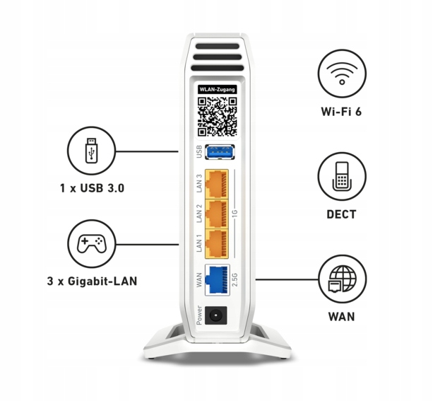 FRITZ!Box 4060 с Wi-Fi 6 — долгожданный преемник проверенной модели FRITZ!Box 4040. Это универсальное устройство, позволяющее подключаться через 2,5-гигабитную WAN. Дополнительно в роутере имеется встроенная АТС для VoIP-телефонии. Маршрутизатор оснащен базой DECT, которая позволяет подключать беспроводные наушники и умные розетки FRITZ!DECT 200/210 или термостаты FRITZ!DECT 301 и FRITZ!DECT 302, умные лампочки FRITZ!DECT 500 и выключатели FRITZ!DECT 440. 1 порт USB 3.0 позволяет создать медиасервер и NAS-накопитель после подключения портативных накопителей.