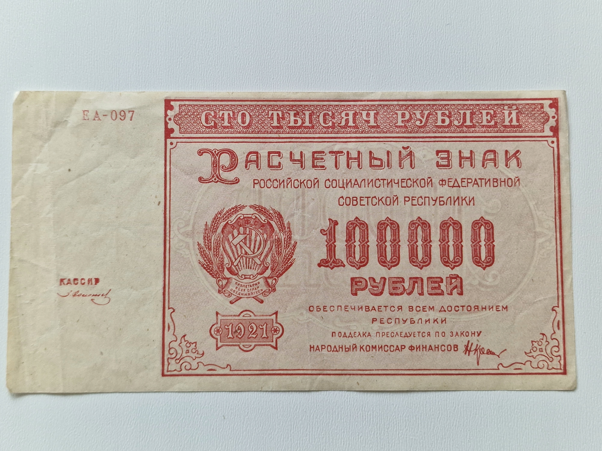 **ФСЛ** РОССИЯ - 100 000 РУБЛЕЙ - 1921 г. - ВФ