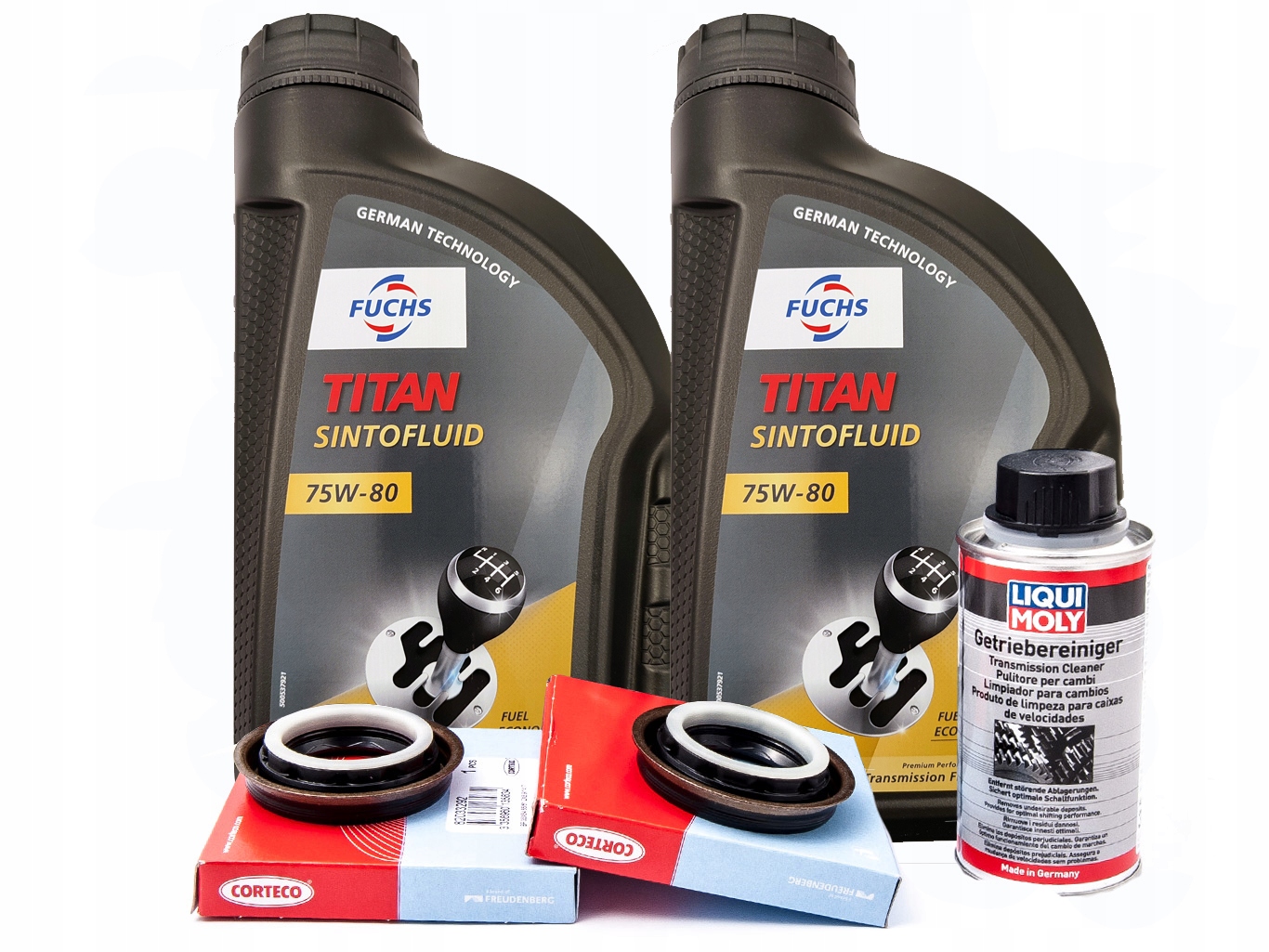 Комплект сальников полуосей, трансмиссионное масло FUCHS TITAN SINTOFLUID SAE 75W-80 2л и промывка для 6-ступенчатых МКПП F40 и M32