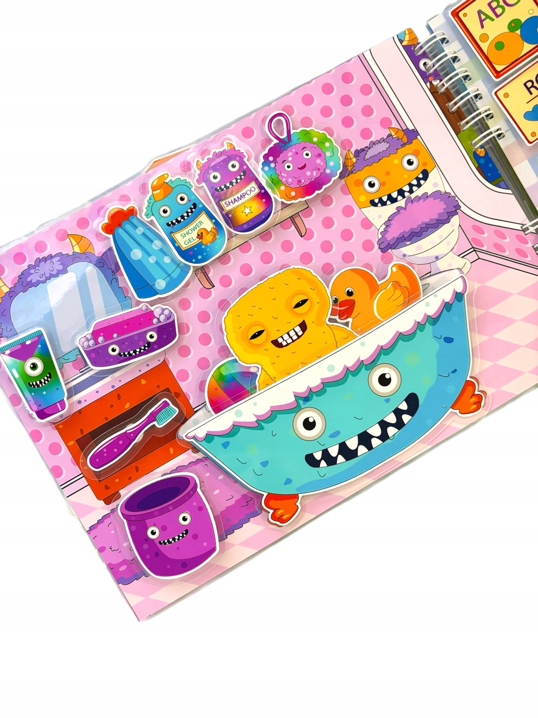Книга переносит ребенка в веселый мир монстров, где он сможет самостоятельно создавать сценки, наряжать персонажей и играть в повседневные ситуации.