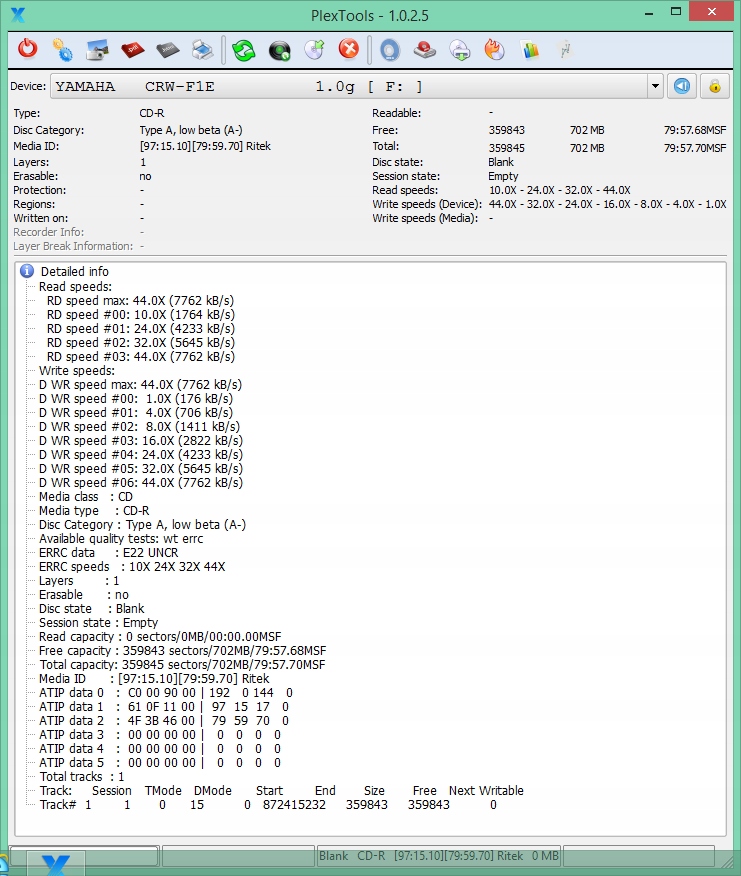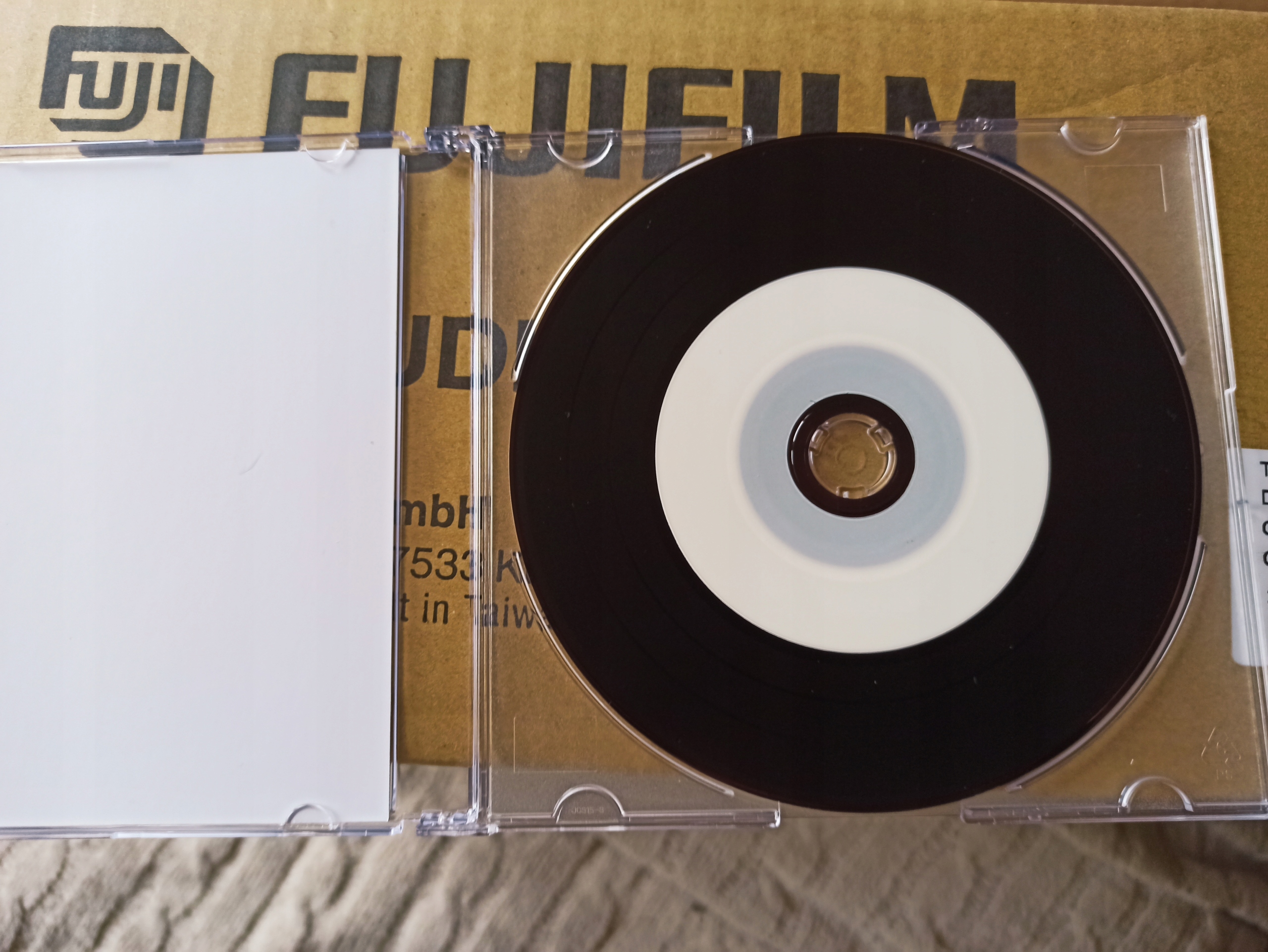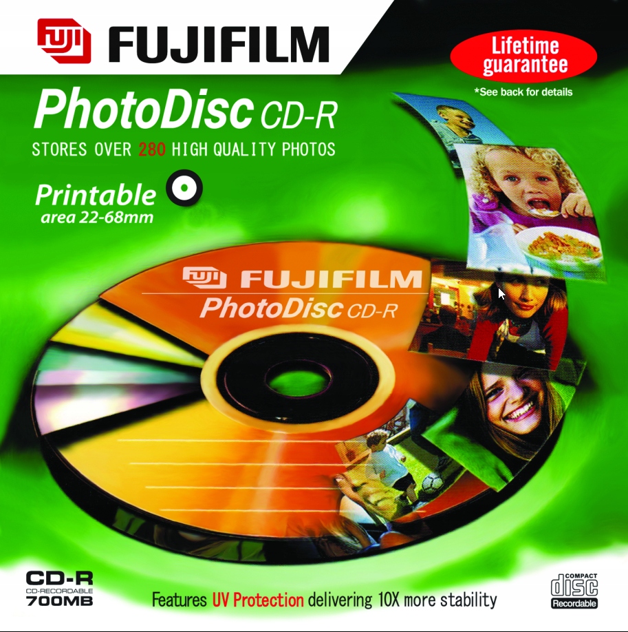 Fuji CD-R 700 МБ, архив с фотографиями, 1 шт. Версия для струйной печати — диапазон печати 22–68 мм, код MID\ATIP: 97m15s10/17f. Диск изготовлен по технологии Fuji Black Dye, то есть специальному черному защитному слою, обеспечивающему максимальную защиту хранящихся на нем данных, фотографий, музыки и т. д. от УФ-лучей и вредного воздействия солнечных лучей и высоких температур. Производитель указывает долговечность данных в течение 100 лет при условии правильной записи, использования и хранения.