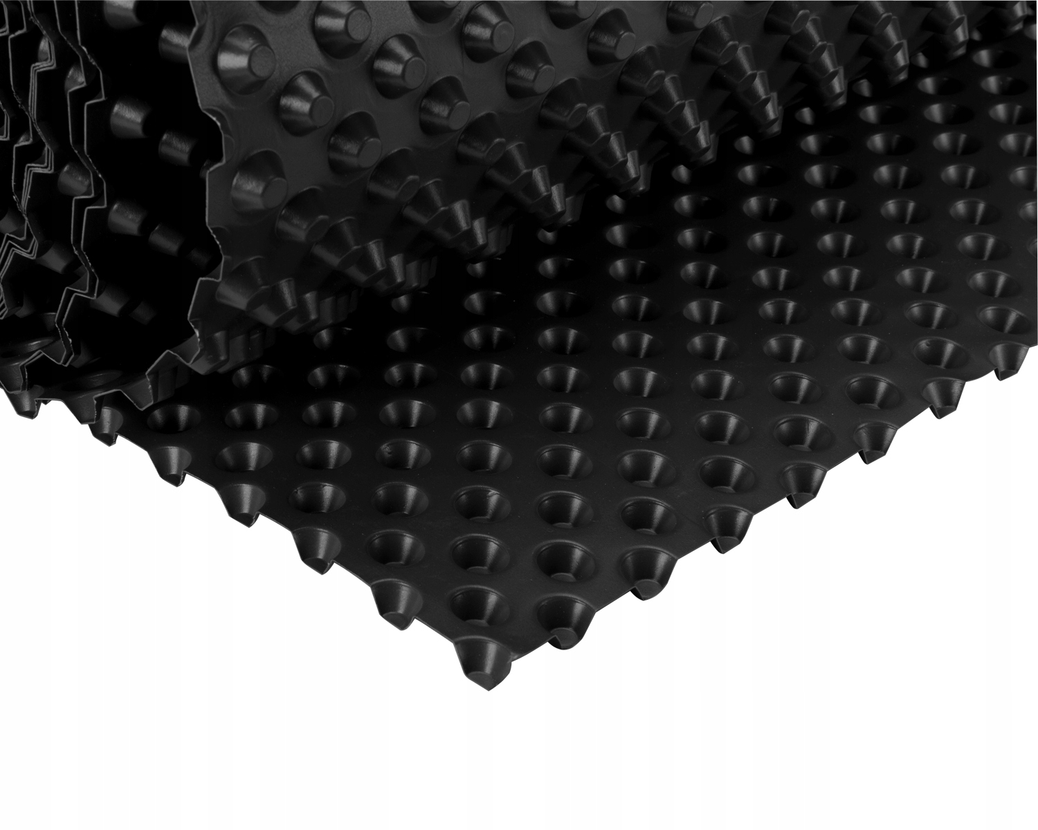 Гидроизоляционная пленка помогает защитить от воды и влаги. Специфические рельефы в форме усеченных конусов напоминают ведра. Изготовлен из пластика – полиэтилена, отличающегося высокой плотностью (HDPE).