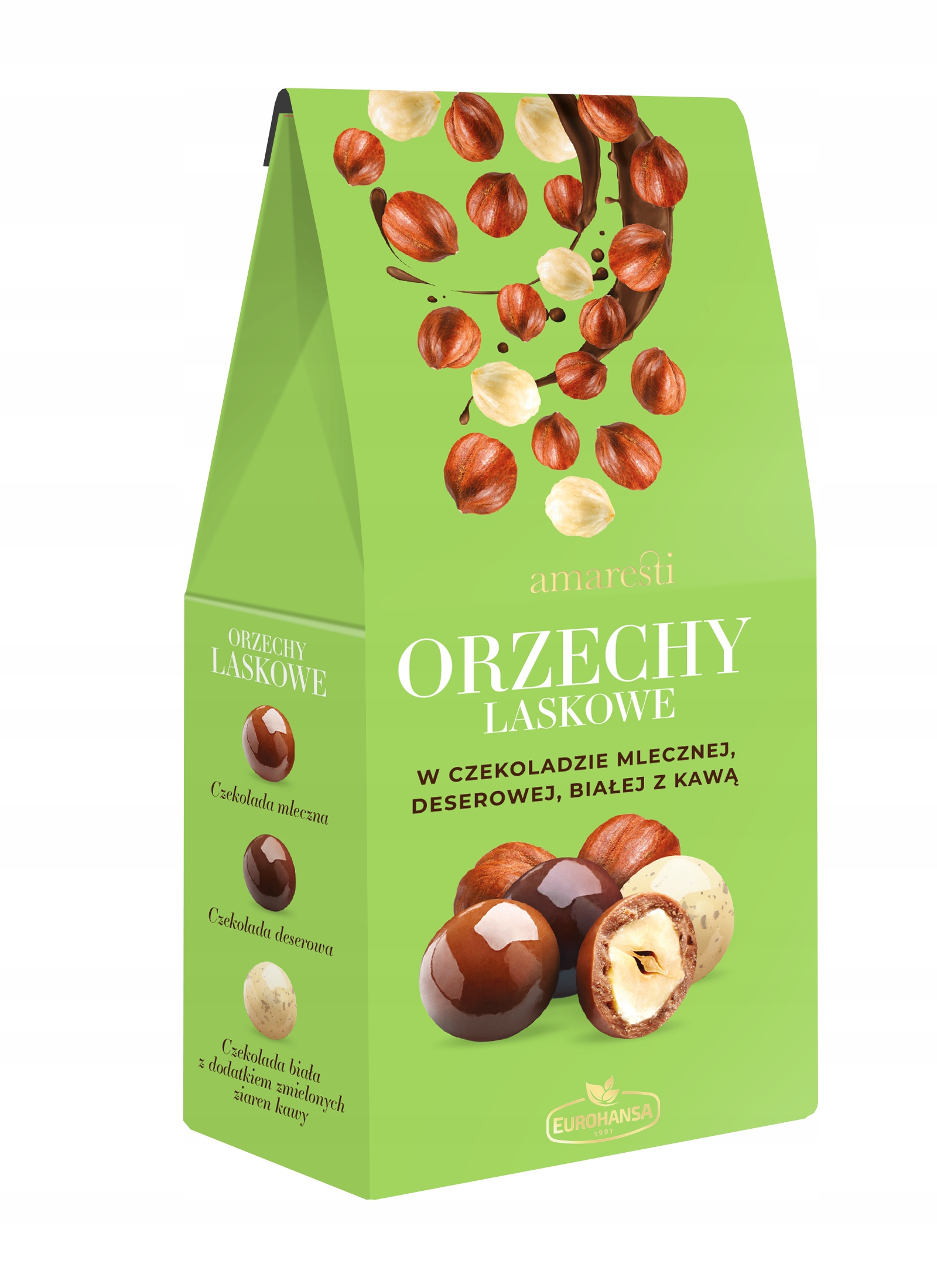 Новая упаковка AMARESTI - Фундук в молочном, темном и белом шоколаде с кофепредставляет собой изящную коробочку, благодаря которой эти уникальные конфеты станут прекрасным сладким, очаровательным подарком.