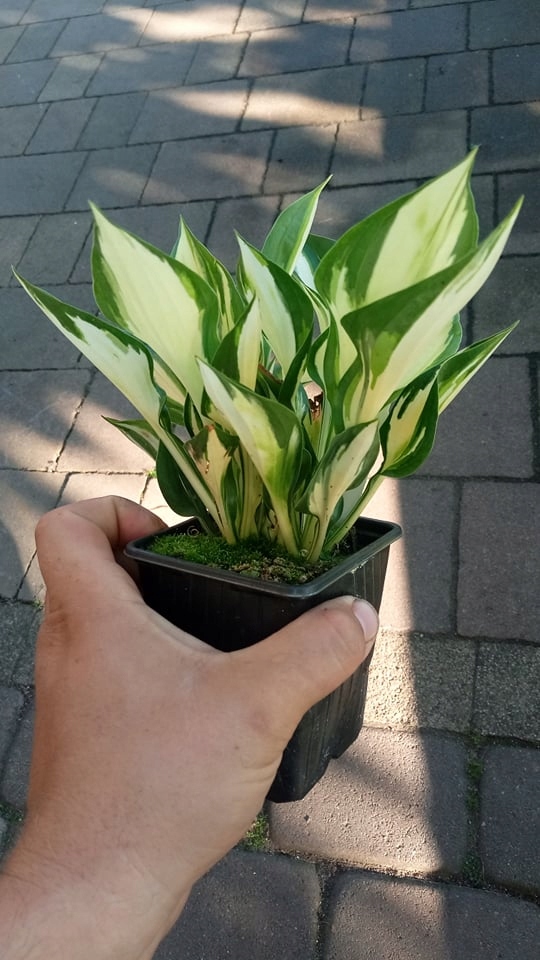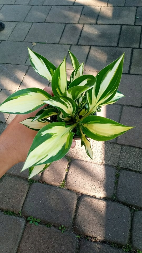 Средний -сированный Funkia Fire and Ice с захватывающими листьями. Листья с чрезвычайно контрастным цветом, с чистым агентом и темно -зеленым краем.