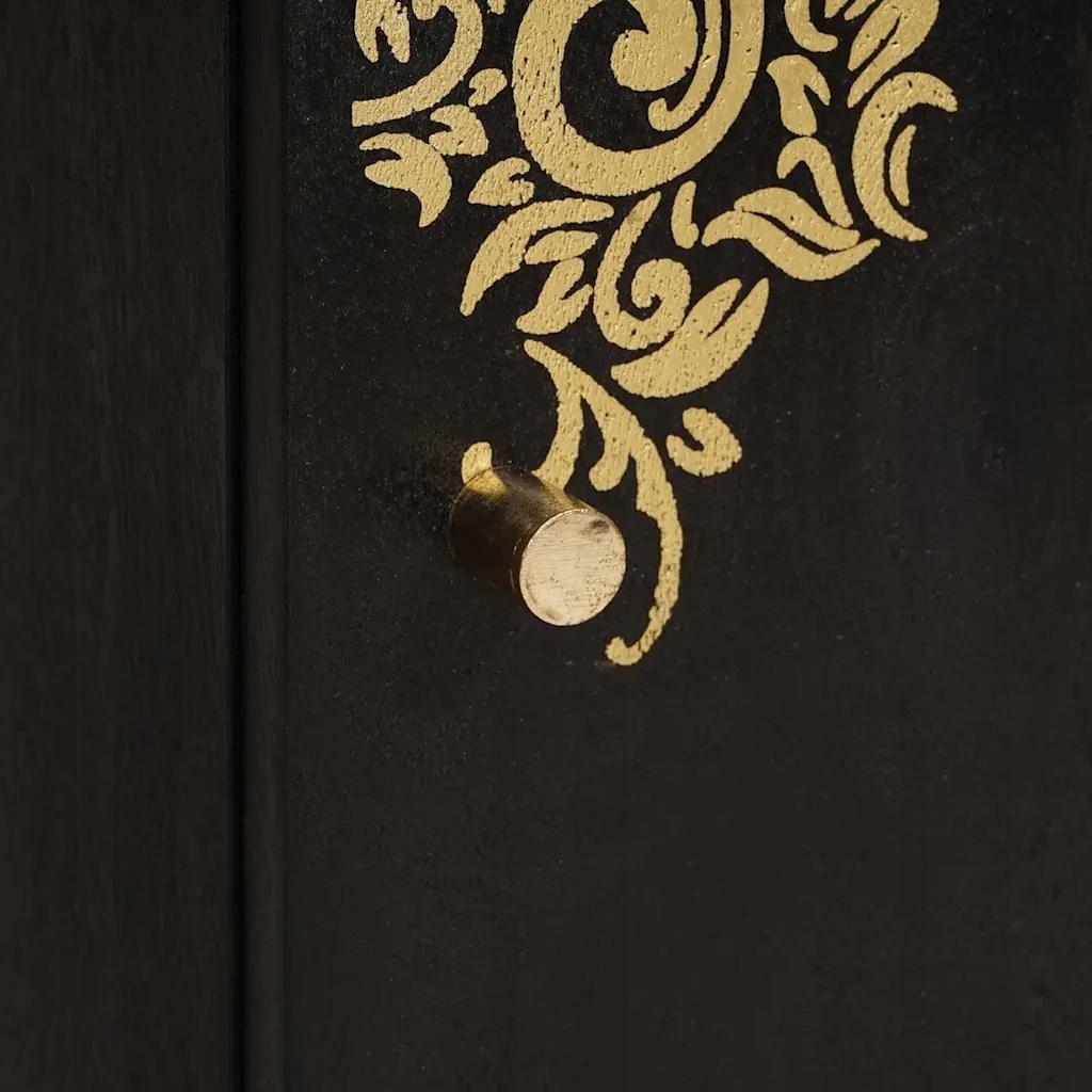 - Золотые декоративные акценты. Этот буфет с замысловатыми золотыми узорами на внешней стороне придаст вашему интерьеру роскошные нотки. Он гармонирует с элегантными латунными деталями, подчеркивающими современный вид мебели.